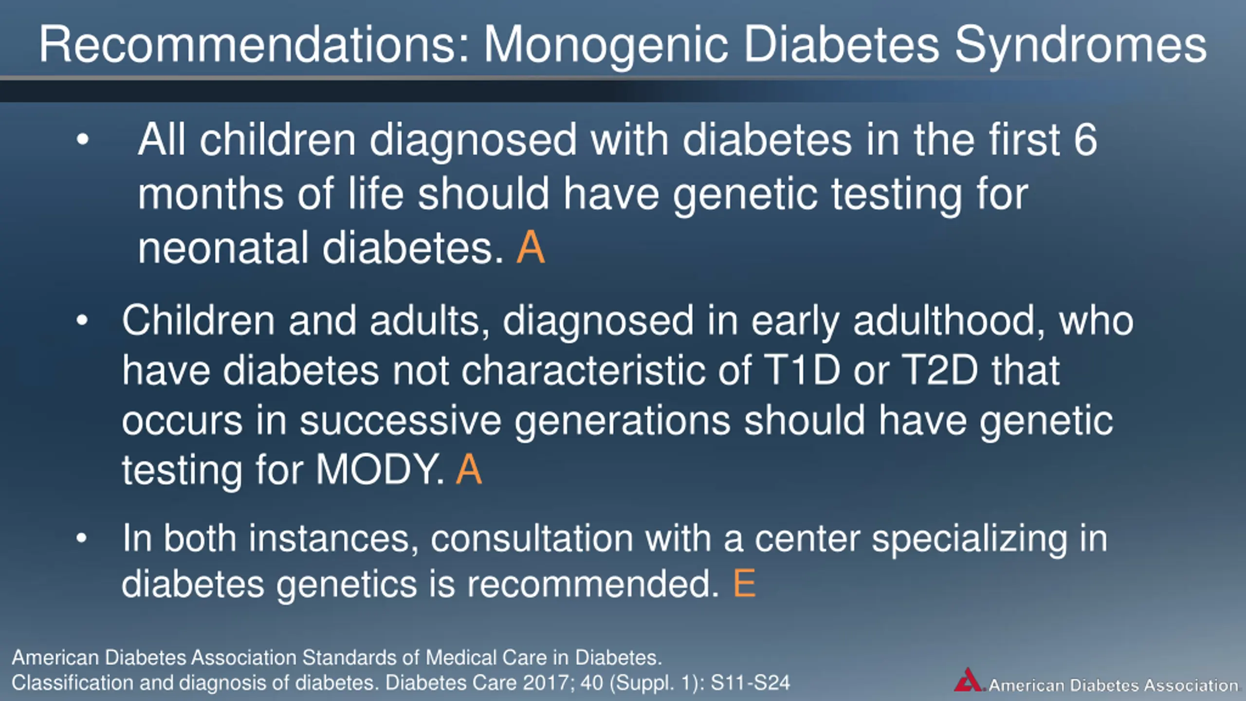 Recommendations: Monogenic Diabetes Syndromes All children diagnosed with diabetes in the first 6 months of life should have genetic testing for neonatal diabetes. A Children and adults, diagnosed in early adulthood, who have diabetes not characteristic of T1D or T2D that occurs in successive generations should have genetic testing for MODY. A In both instances, consultation with a center specializing in diabetes genetics is recommended. E American Diabetes Association Standards of Medical Care in Diabetes. Classification and diagnosis of diabetes. Diabetes Care 2017; 40 (Suppl. 1): S11-S24
