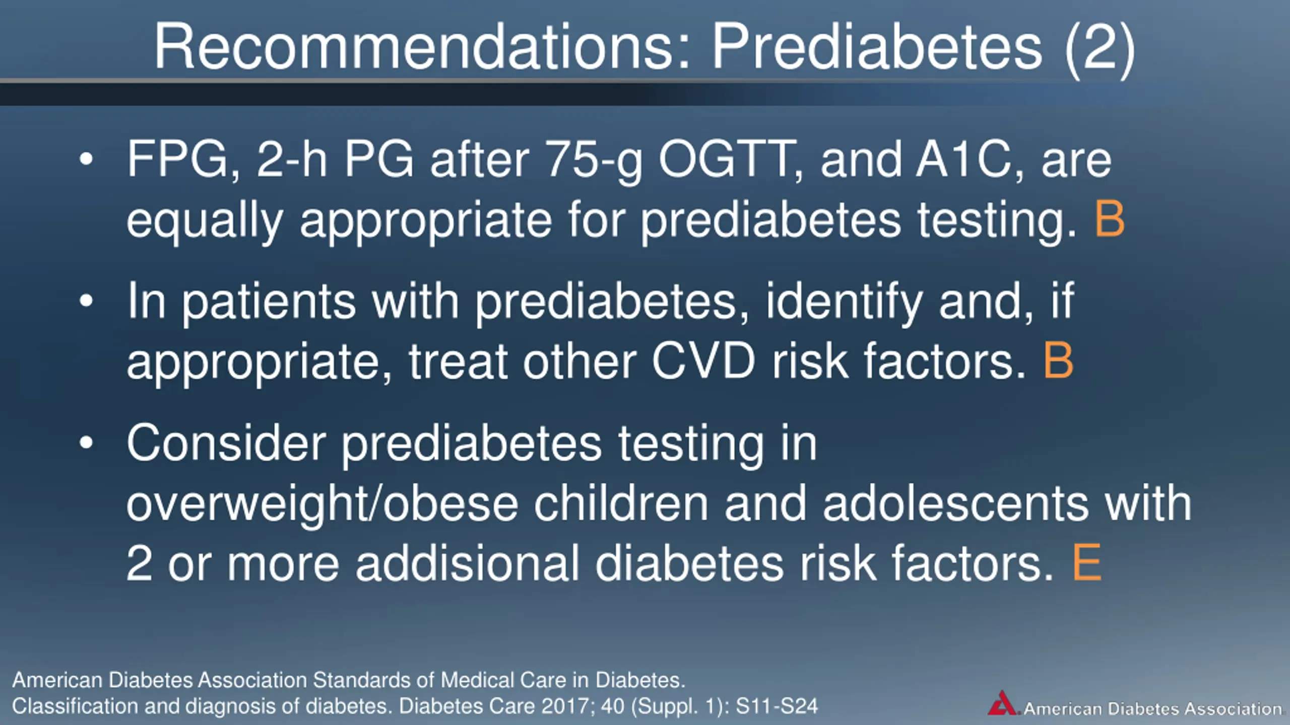 Recommendations: Prediabetes (2) FPG, 2-h PG after 75-g OGTT, and A1C, are equally appropriate for prediabetes testing. B In patients with prediabetes, identify and, if appropriate, treat other CVD risk factors. B Consider prediabetes testing in overweight/obese children and adolescents with 2 or more addisional diabetes risk factors. E American Diabetes Association Standards of Medical Care in Diabetes. Classification and diagnosis of diabetes. Diabetes Care 2017; 40 (Suppl. 1): S11-S24