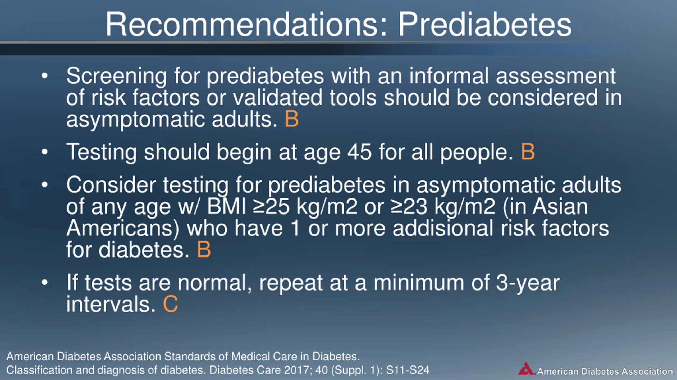 Recommendations: Prediabetes Screening for prediabetes with an informal assessment of risk factors or validated tools should be considered in asymptomatic adults. B Testing should begin at age 45 for all people. B Consider testing for prediabetes in asymptomatic adults of any age w/ BMI 25 kg/m2 or 23 kg/m2 (in Asian Americans) who have 1 or more addisional risk factors for diabetes. B If tests are normal, repeat at a minimum of 3-year intervals. C American Diabetes Association Standards of Medical Care in Diabetes. Classification and diagnosis of diabetes. Diabetes Care 2017; 40 (Suppl. 1): S11-S24