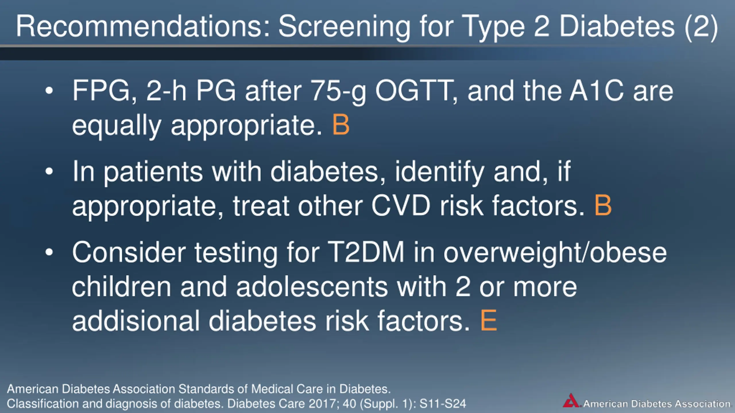 Recommendations: Screening for Type 2 Diabetes (2) FPG, 2-h PG after 75-g OGTT, and the A1C are equally appropriate. B In patients with diabetes, identify and, if appropriate, treat other CVD risk factors. B Consider testing for T2DM in overweight/obese children and adolescents with 2 or more addisional diabetes risk factors. E American Diabetes Association Standards of Medical Care in Diabetes. Classification and diagnosis of diabetes. Diabetes Care 2017; 40 (Suppl. 1): S11-S24