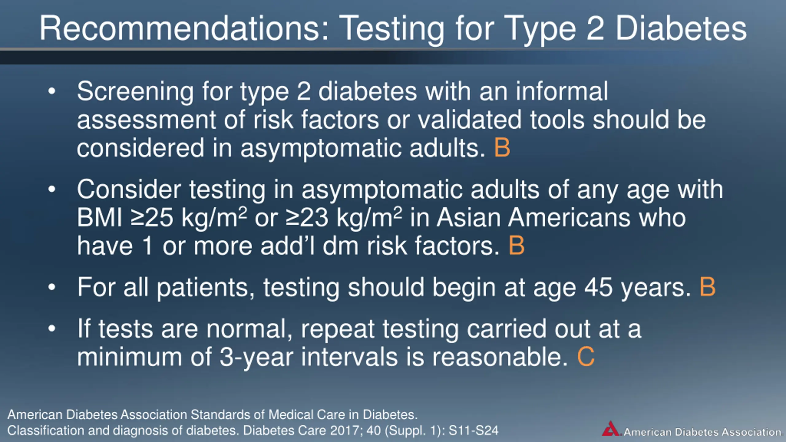Recommendations: Testing for Type 2 Diabetes Screening for type 2 diabetes with an informal assessment of risk factors or validated tools should be considered in asymptomatic adults. B Consider testing in asymptomatic adults of any age with BMI 25 kg/m2or 23 kg/m2 in Asian Americans who have 1 or more add l dm risk factors. B For all patients, testing should begin at age 45 years. B If tests are normal, repeat testing carried out at a minimum of 3-year intervals is reasonable. C American Diabetes Association Standards of Medical Care in Diabetes. Classification and diagnosis of diabetes. Diabetes Care 2017; 40 (Suppl. 1): S11-S24