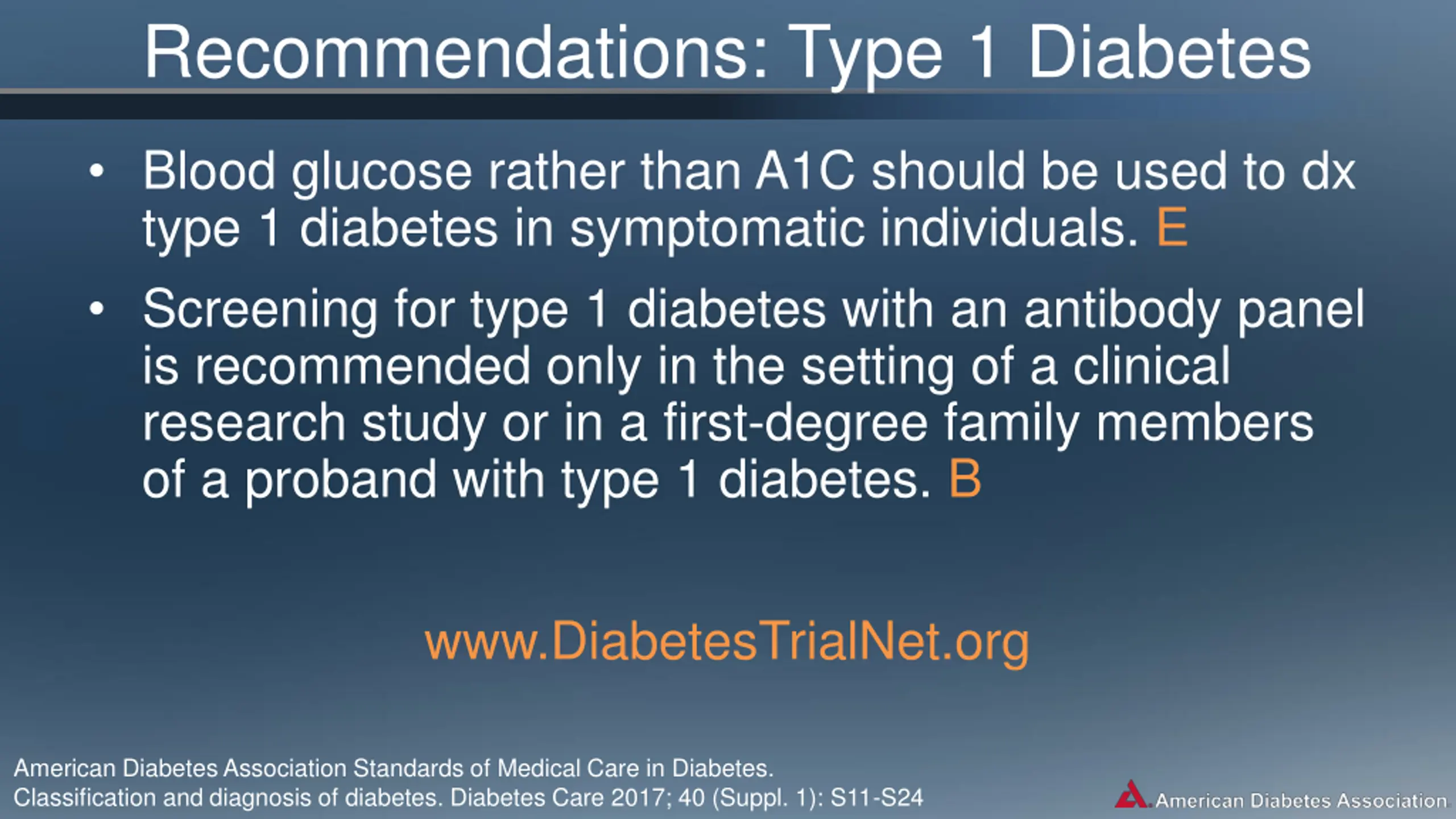 Recommendations: Type 1 Diabetes Blood glucose rather than A1C should be used to dx type 1 diabetes in symptomatic individuals. E Screening for type 1 diabetes with an antibody panel is recommended only in the setting of a clinical research study or in a first-degree family members of a proband with type 1 diabetes. B www.DiabetesTrialNet.org American Diabetes Association Standards of Medical Care in Diabetes. Classification and diagnosis of diabetes. Diabetes Care 2017; 40 (Suppl. 1): S11-S24