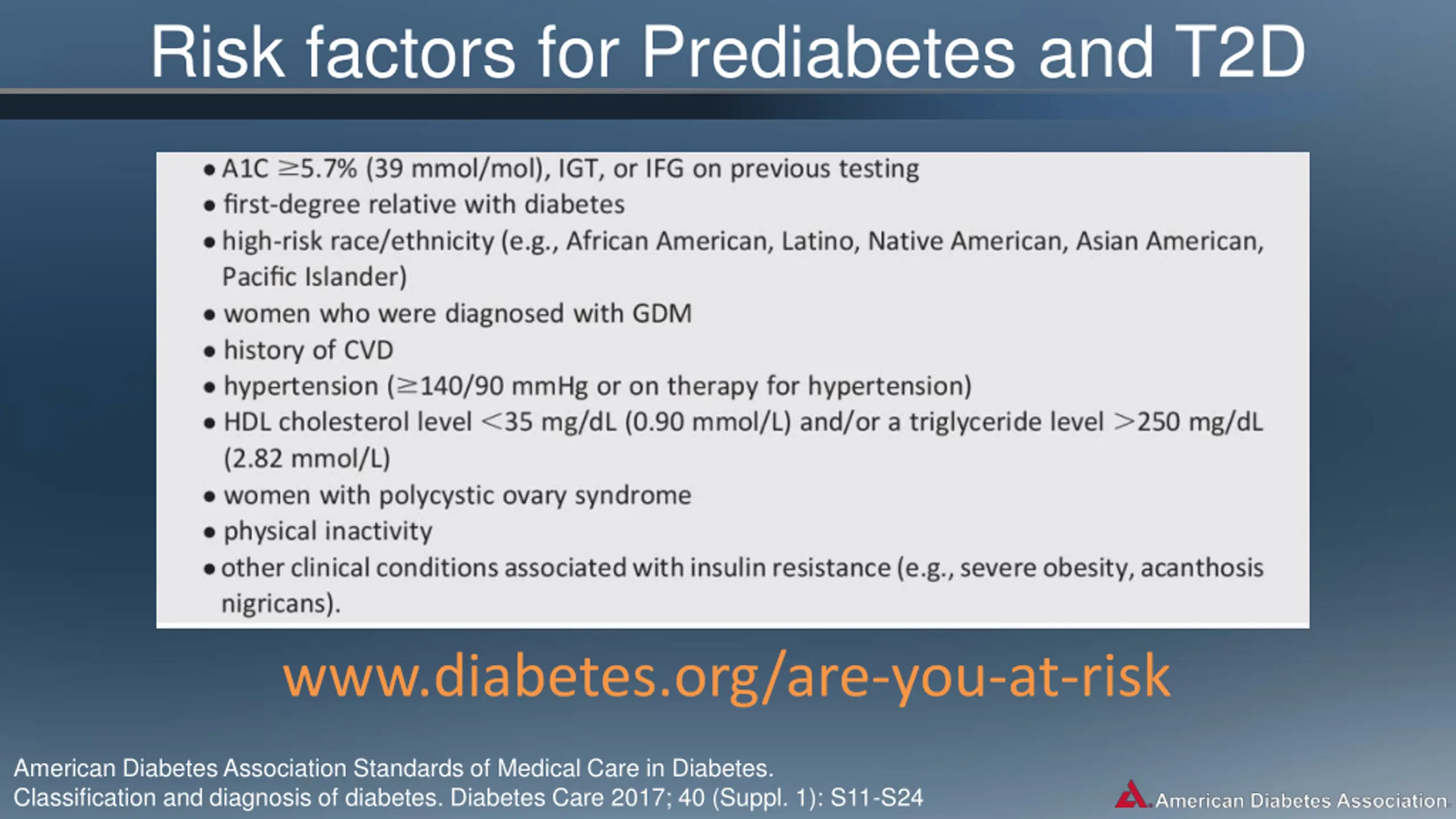 Risk factors for Prediabetes and T2D www.diabetes.org/are-you-at-risk American Diabetes Association Standards of Medical Care in Diabetes. Classification and diagnosis of diabetes. Diabetes Care 2017; 40 (Suppl. 1): S11-S24