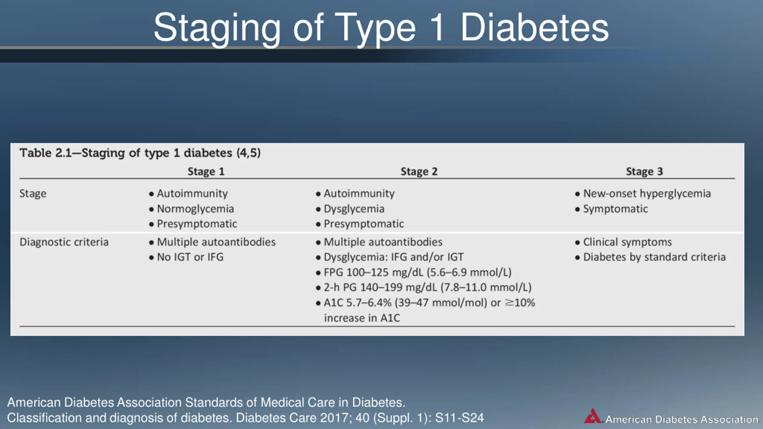 Staging of Type 1 Diabetes American Diabetes Association Standards of Medical Care in Diabetes. Classification and diagnosis of diabetes. Diabetes Care 2017; 40 (Suppl. 1): S11-S24