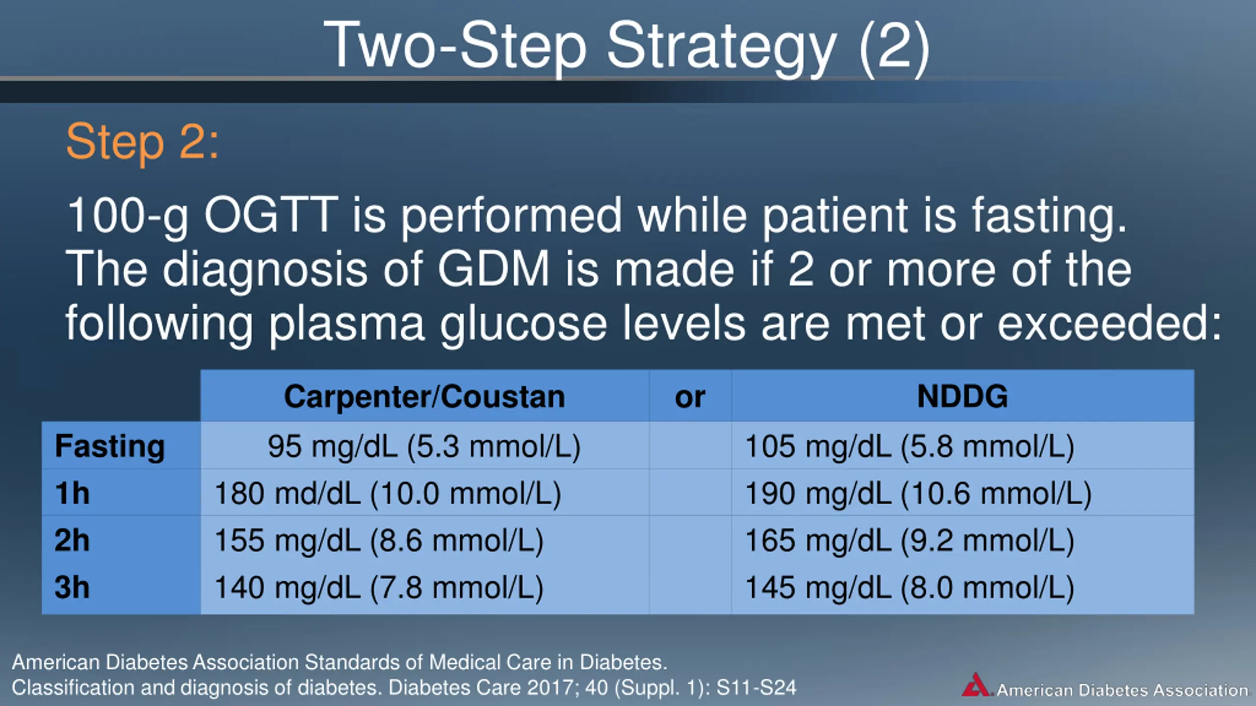 Two-Step Strategy (2) Step 2: 100-g OGTT is performed while patient is fasting. The diagnosis of GDM is made if 2 or more of the following plasma glucose levels are met or exceeded: Carpenter/Coustan 95 mg/dL (5.3 mmol/L) 180 md/dL (10.0 mmol/L) 155 mg/dL (8.6 mmol/L) 140 mg/dL (7.8 mmol/L) or NDDG 105 mg/dL (5.8 mmol/L) 190 mg/dL (10.6 mmol/L) 165 mg/dL (9.2 mmol/L) 145 mg/dL (8.0 mmol/L) Fasting 1h 2h 3h American Diabetes Association Standards of Medical Care in Diabetes. Classification and diagnosis of diabetes. Diabetes Care 2017; 40 (Suppl. 1): S11-S24