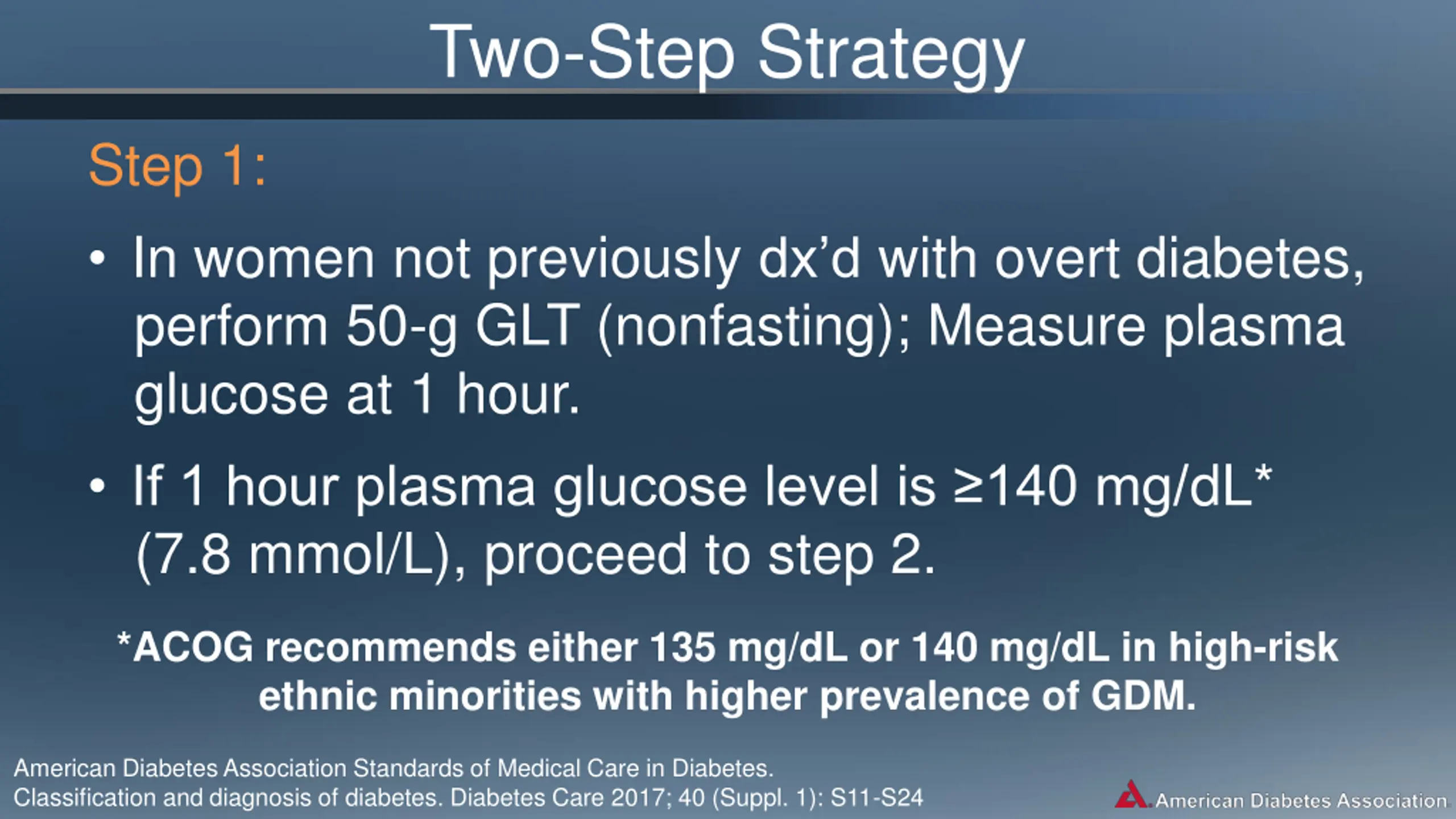 Two-Step Strategy Step 1: In women not previously dx d with overt diabetes, perform 50-g GLT (nonfasting); Measure plasma glucose at 1 hour. If 1 hour plasma glucose level is 140 mg/dL* (7.8 mmol/L), proceed to step 2. *ACOG recommends either 135 mg/dL or 140 mg/dL in high-risk ethnic minorities with higher prevalence of GDM. American Diabetes Association Standards of Medical Care in Diabetes. Classification and diagnosis of diabetes. Diabetes Care 2017; 40 (Suppl. 1): S11-S24