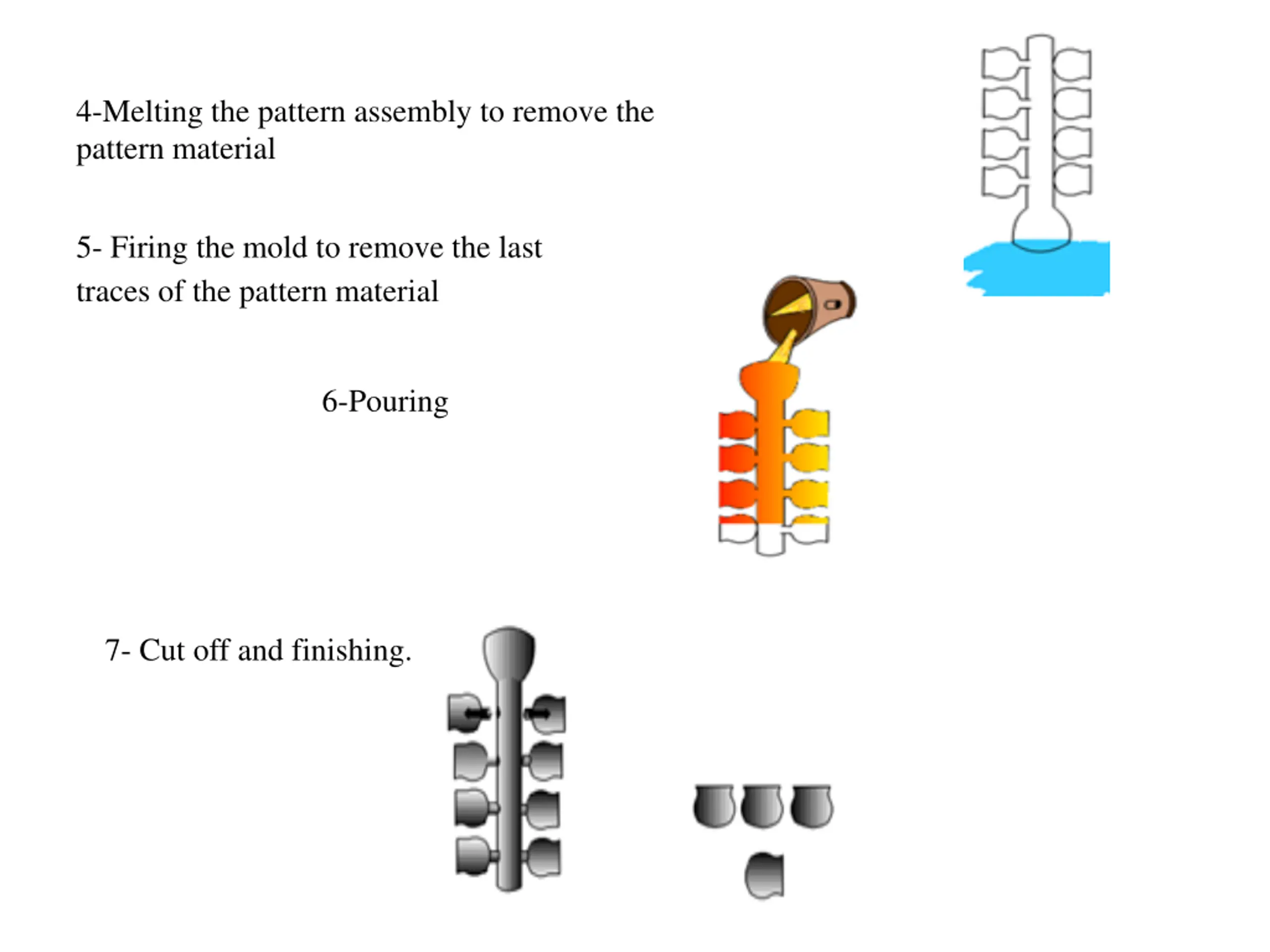 4-Melting the pattern assembly to remove the pattern material 5- Firing the mold to remove the last traces of the pattern material 6-Pouring 7- Cut off and finishing.