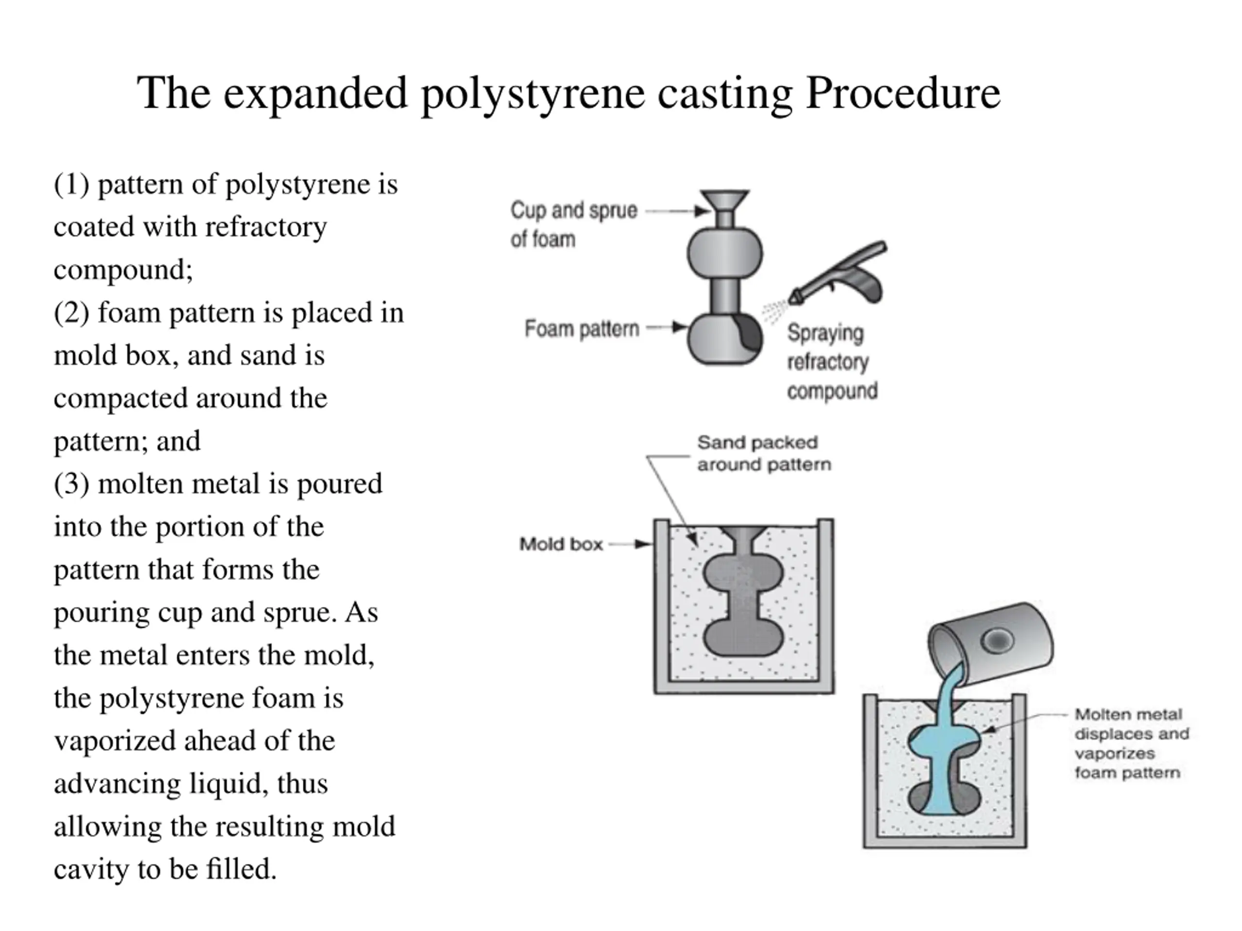 The expanded polystyrene casting Procedure (1) pattern of polystyrene is coated with refractory compound; (2) foam pattern is placed in mold box, and sand is compacted around the pattern; and (3) molten metal is poured into the portion of the pattern that forms the pouring cup and sprue. As the metal enters the mold, the polystyrene foam is vaporized ahead of the advancing liquid, thus allowing the resulting mold cavity to be filled.