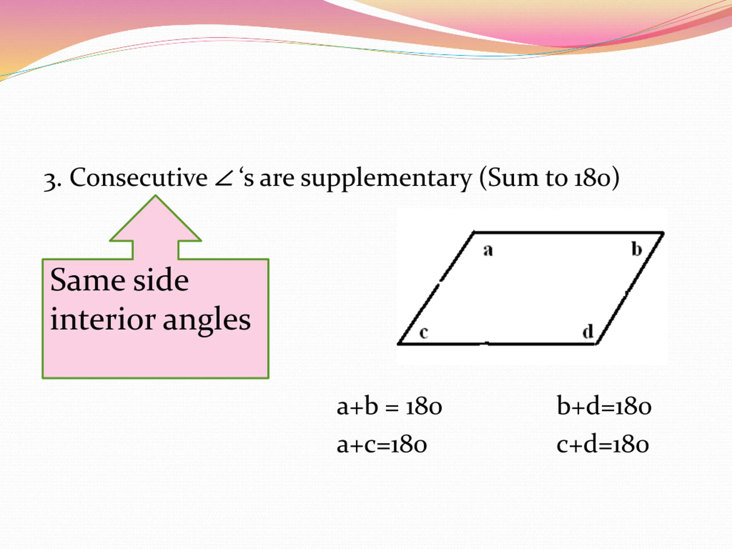 3. Consecutive s are supplementary (Sum to 180) Same side interior angles a+b = 180 a+c=180 b+d=180 c+d=180