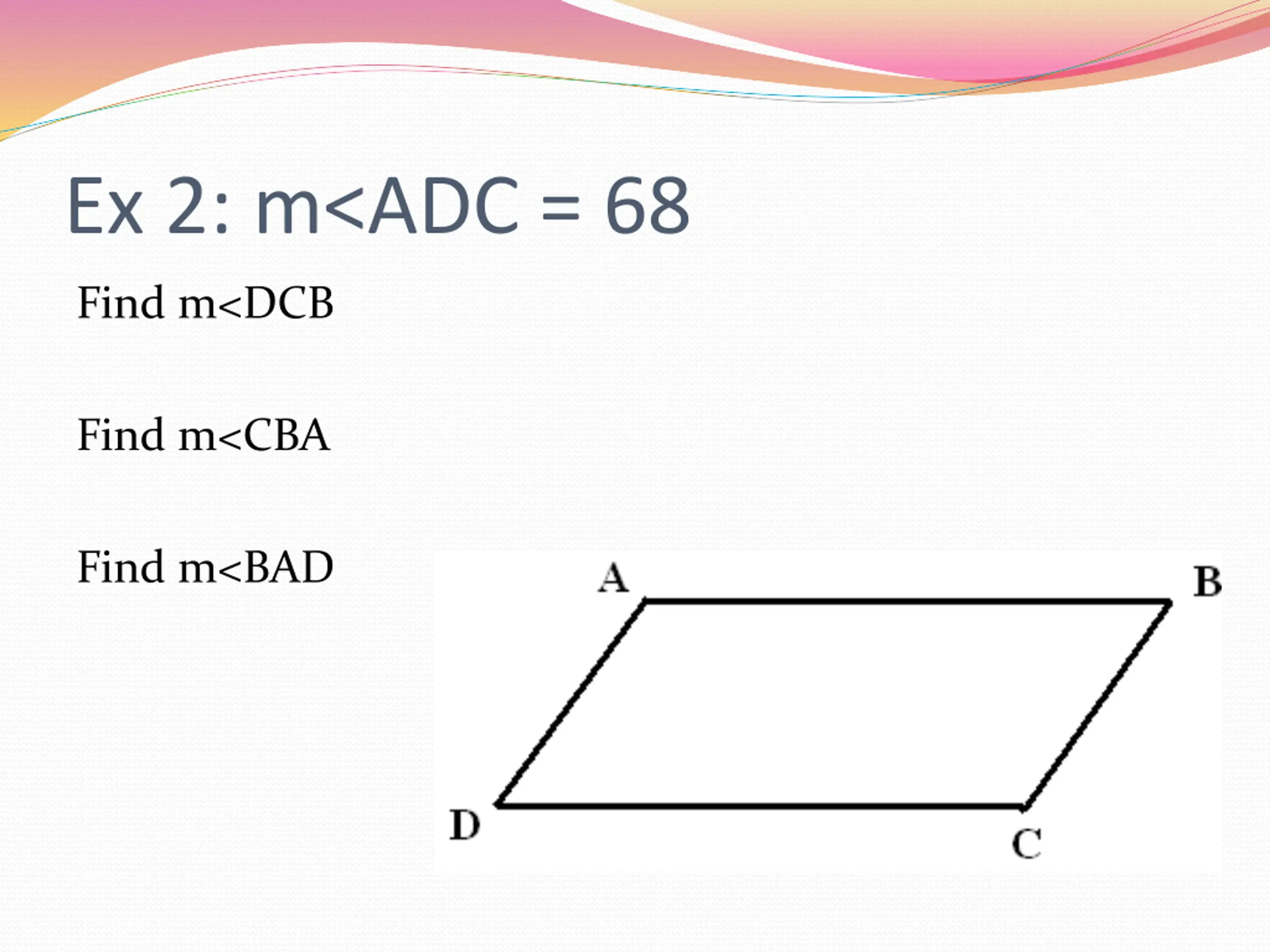 Ex 2: m<ADC = 68 Find m<DCB Find m<CBA Find m<BAD