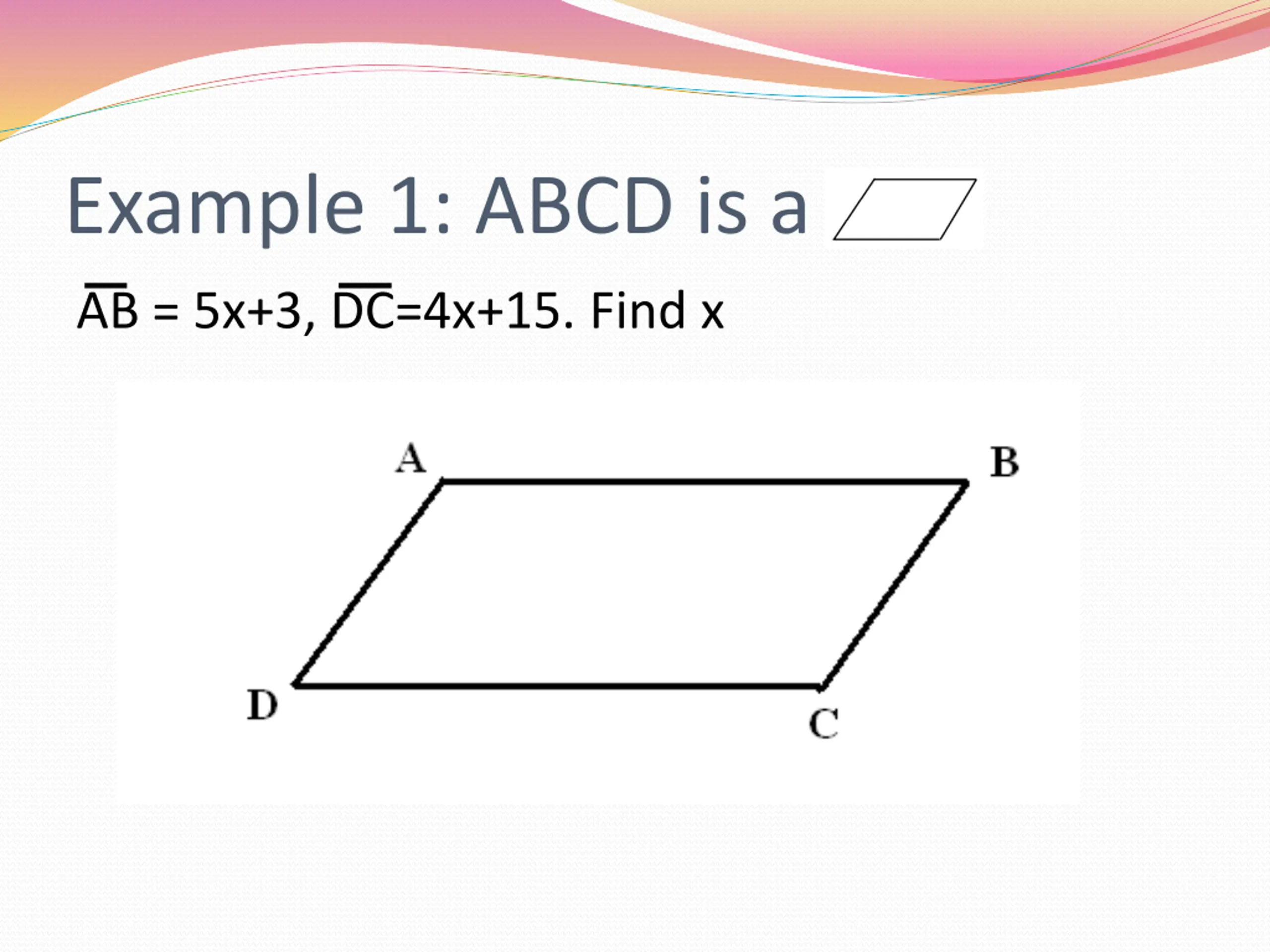 Example 1: ABCD is a AB = 5x+3, DC=4x+15. Find x