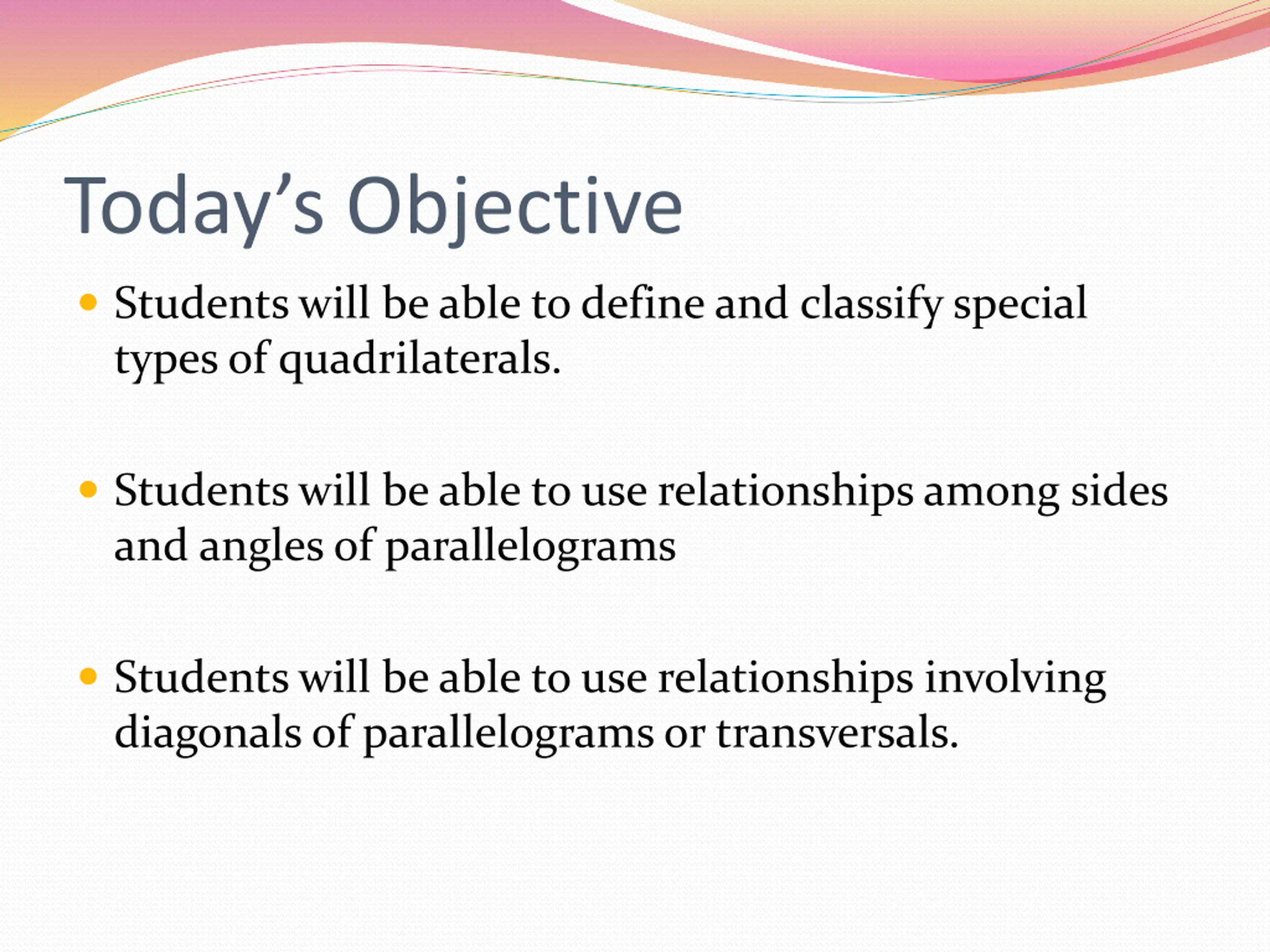 Todays Objective Students will be able to define and classify special types of quadrilaterals. Students will be able to use relationships among sides and angles of parallelograms Students will be able to use relationships involving diagonals of parallelograms or transversals.