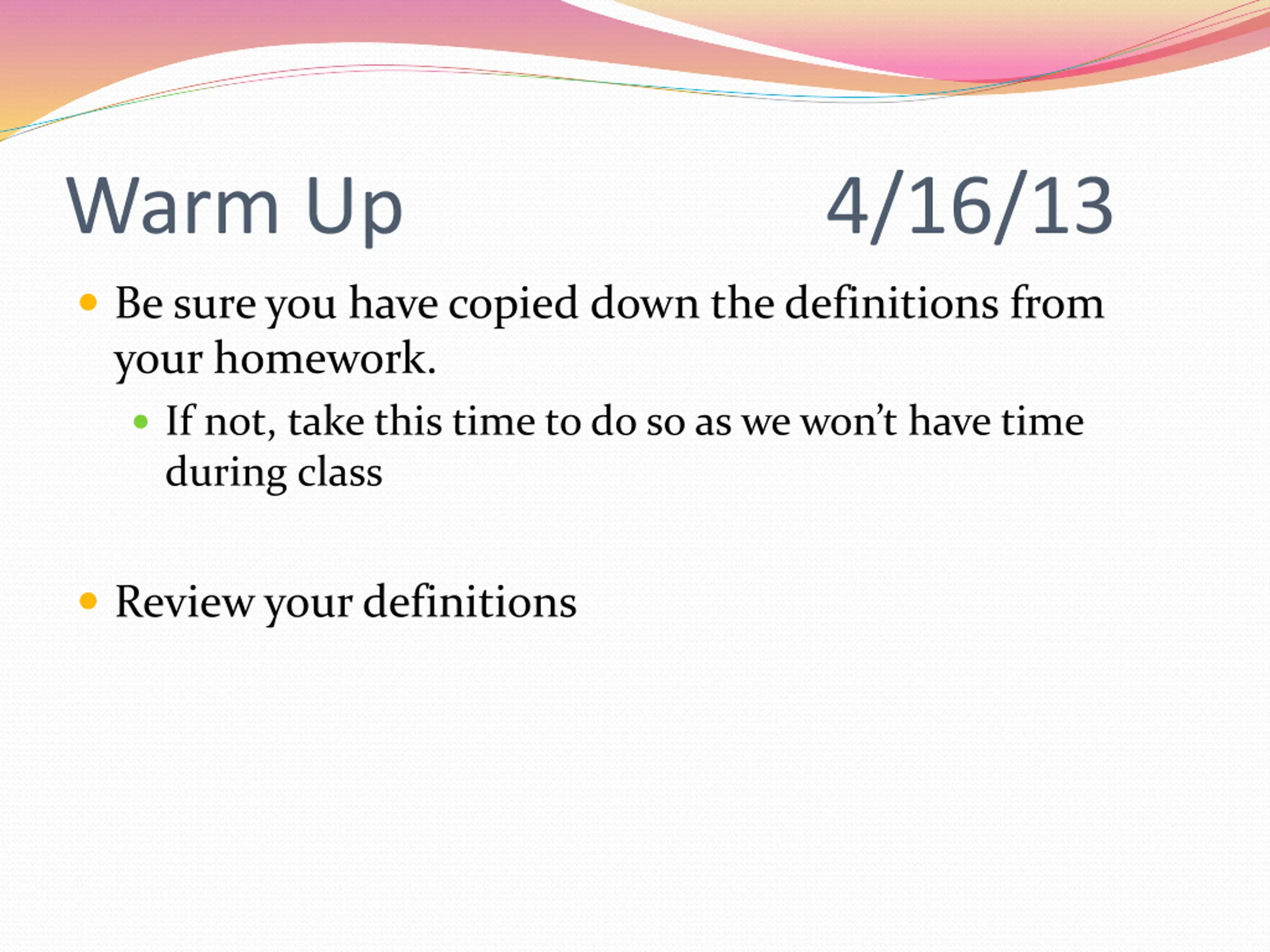 Warm Up 4/16/13 Be sure you have copied down the definitions from your homework. If not, take this time to do so as we won t have time during class Review your definitions
