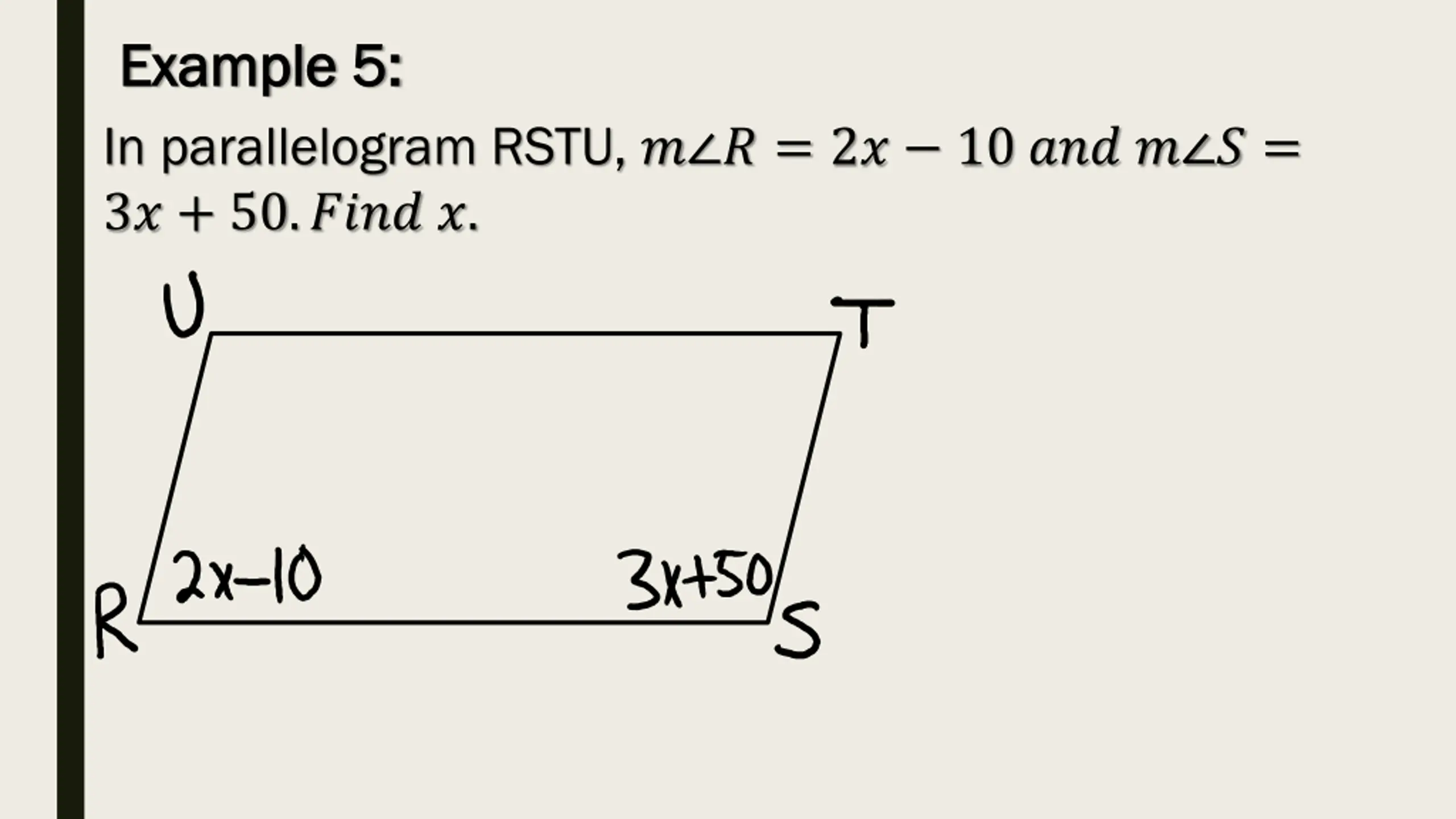 Example 5: Example 5: In parallelogram RSTU, ? ? = 2? 10 ??? ? ? = 3? + 50.???? ?.