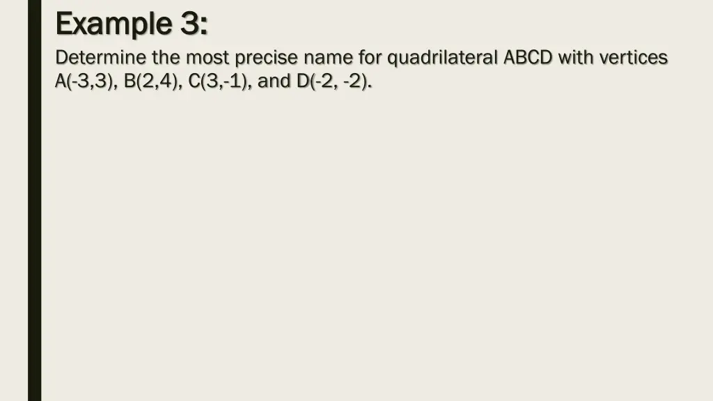 Example 3: Example 3: Determine the most precise name for quadrilateral ABCD with vertices A(-3,3), B(2,4), C(3,-1), and D(-2, -2).