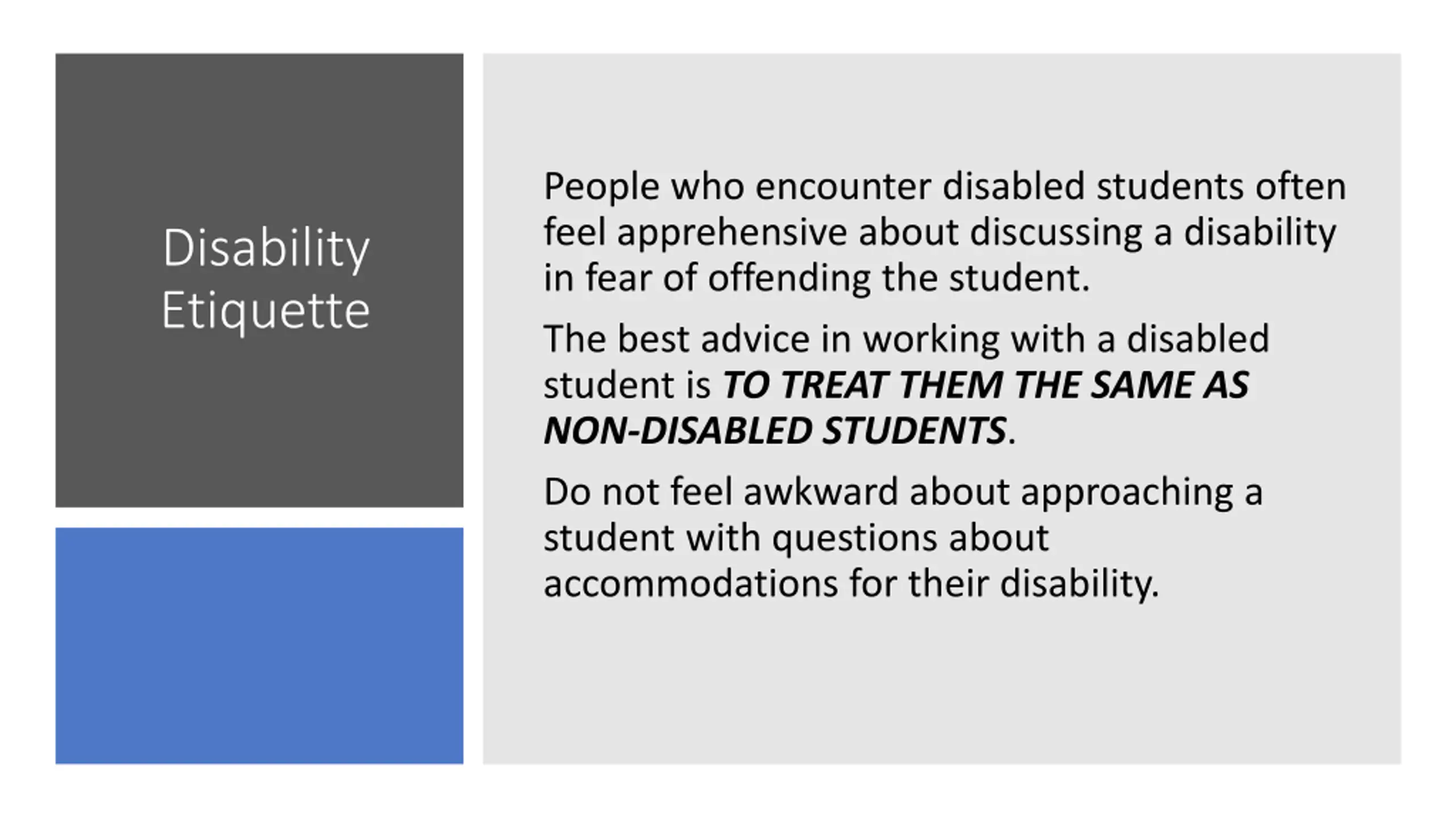 People who encounter disabled students often feel apprehensive about discussing a disability in fear of offending the student. The best advice in working with a disabled student is TO TREAT THEM THE SAME AS NON-DISABLED STUDENTS. Do not feel awkward about approaching a student with questions about accommodations for their disability. Disability Etiquette