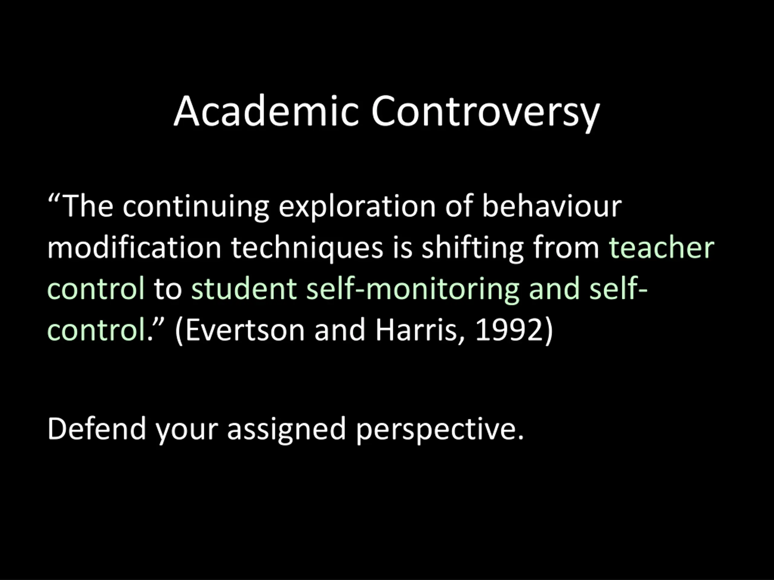 Academic Controversy The continuing exploration of behaviour modification techniques is shifting from teacher control to student self-monitoring and self- control. (Evertson and Harris, 1992) Defend your assigned perspective.