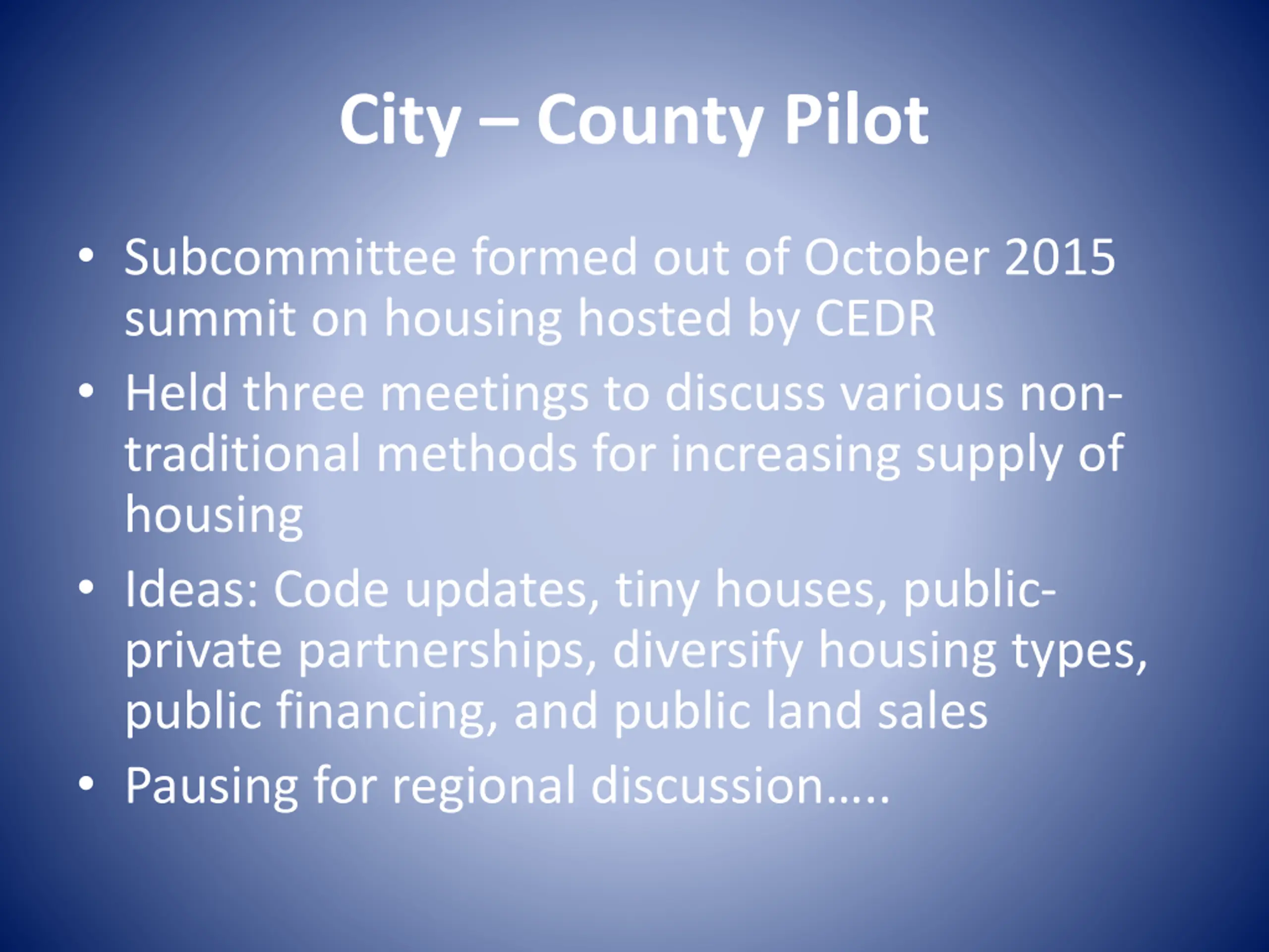 City County Pilot Subcommittee formed out of October 2015 summit on housing hosted by CEDR Held three meetings to discuss various non- traditional methods for increasing supply of housing Ideas: Code updates, tiny houses, public- private partnerships, diversify housing types, public financing, and public land sales Pausing for regional discussion ..