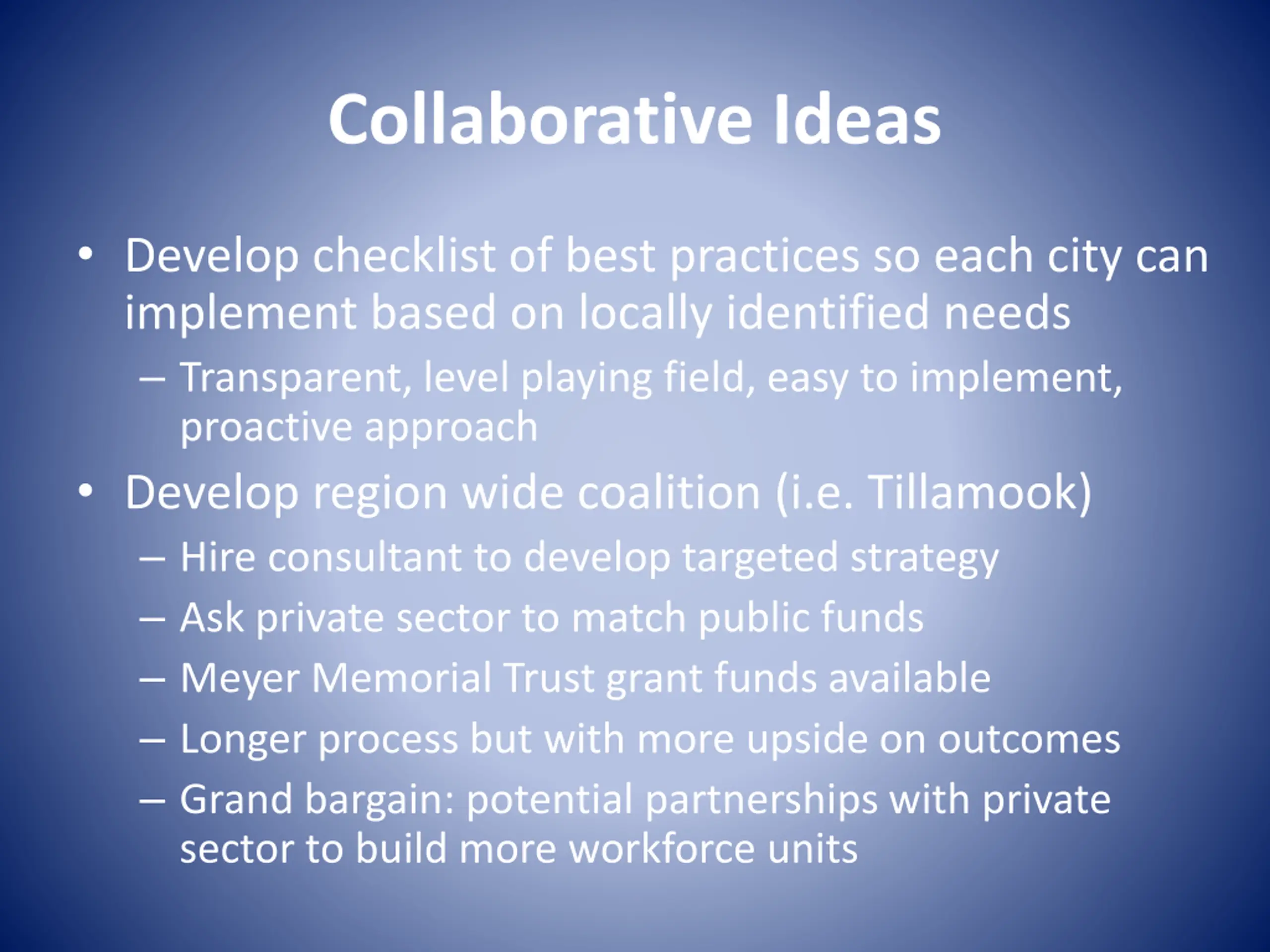 Collaborative Ideas Develop checklist of best practices so each city can implement based on locally identified needs Transparent, level playing field, easy to implement, proactive approach Develop region wide coalition (i.e. Tillamook) Hire consultant to develop targeted strategy Ask private sector to match public funds Meyer Memorial Trust grant funds available Longer process but with more upside on outcomes Grand bargain: potential partnerships with private sector to build more workforce units