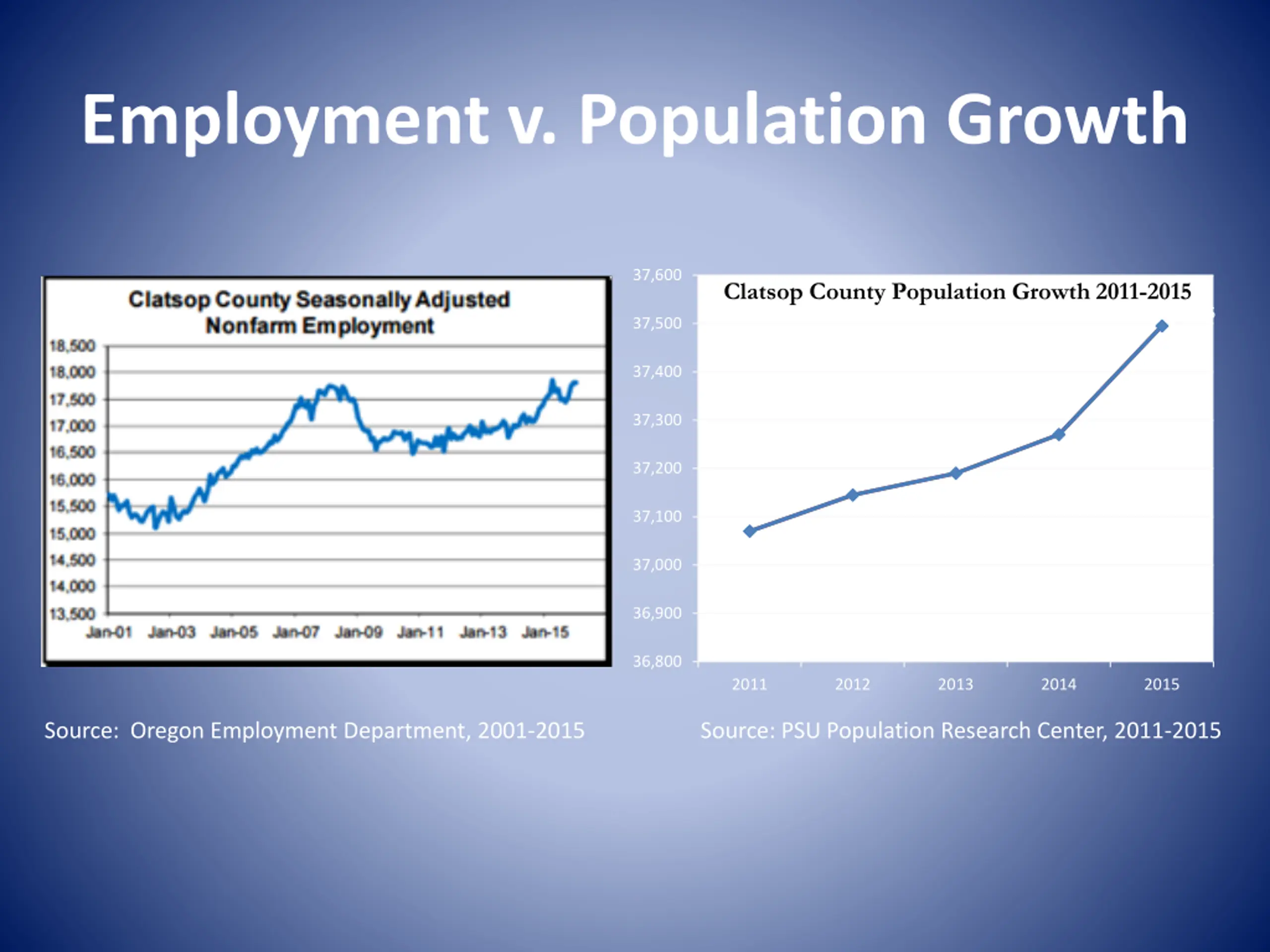 Employment v. Population Growth 37,600 Clatsop County Population Growth 2011-2015 37,495 37,500 37,400 37,300 37,270 37,200 37,190 37,145 37,100 37,070 37,000 36,900 36,800 2011 2012 2013 2014 2015 Source: Oregon Employment Department, 2001-2015 Source: PSU Population Research Center, 2011-2015