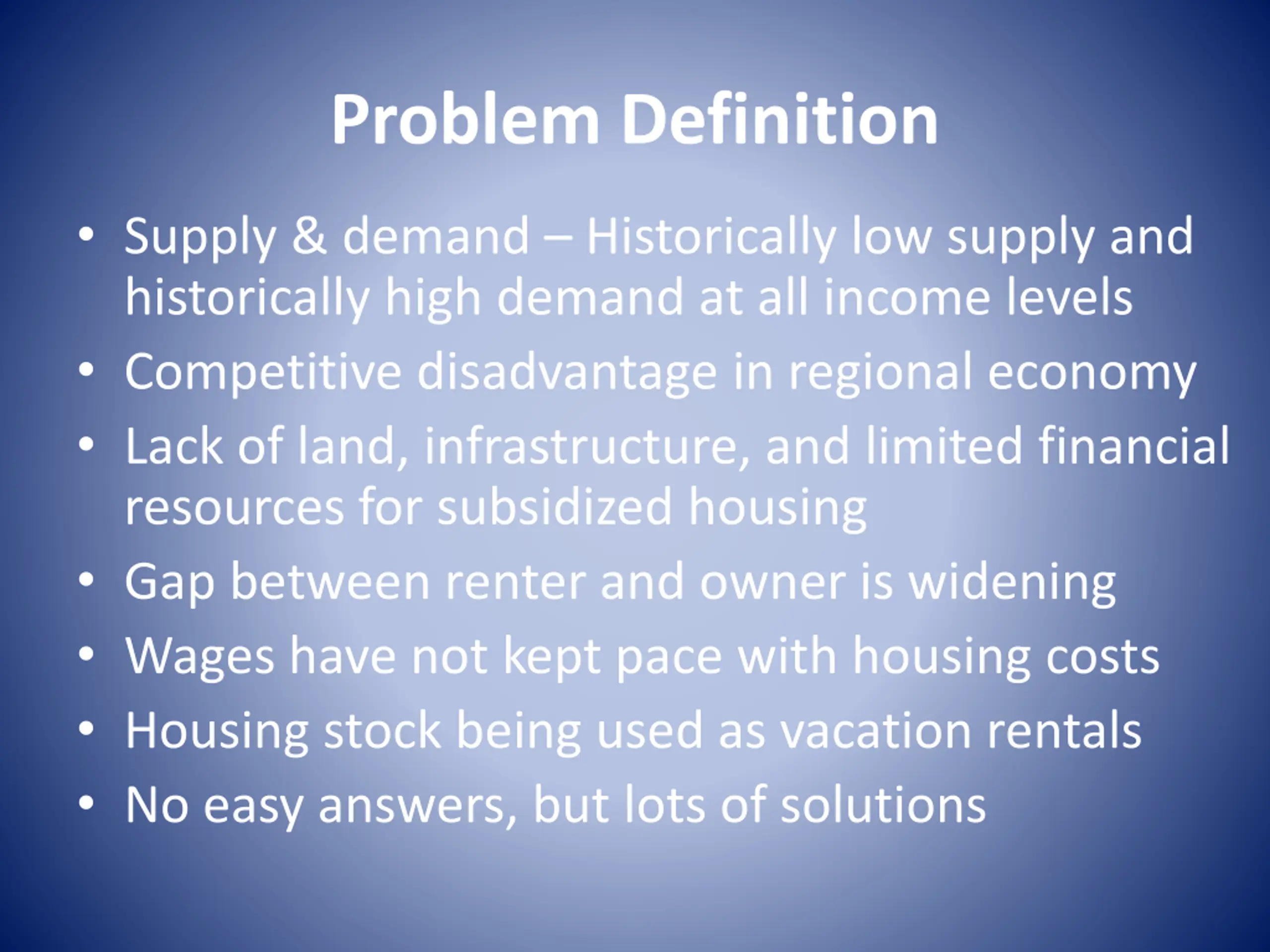 Problem Definition Supply & demand Historically low supply and historically high demand at all income levels Competitive disadvantage in regional economy Lack of land, infrastructure, and limited financial resources for subsidized housing Gap between renter and owner is widening Wages have not kept pace with housing costs Housing stock being used as vacation rentals No easy answers, but lots of solutions