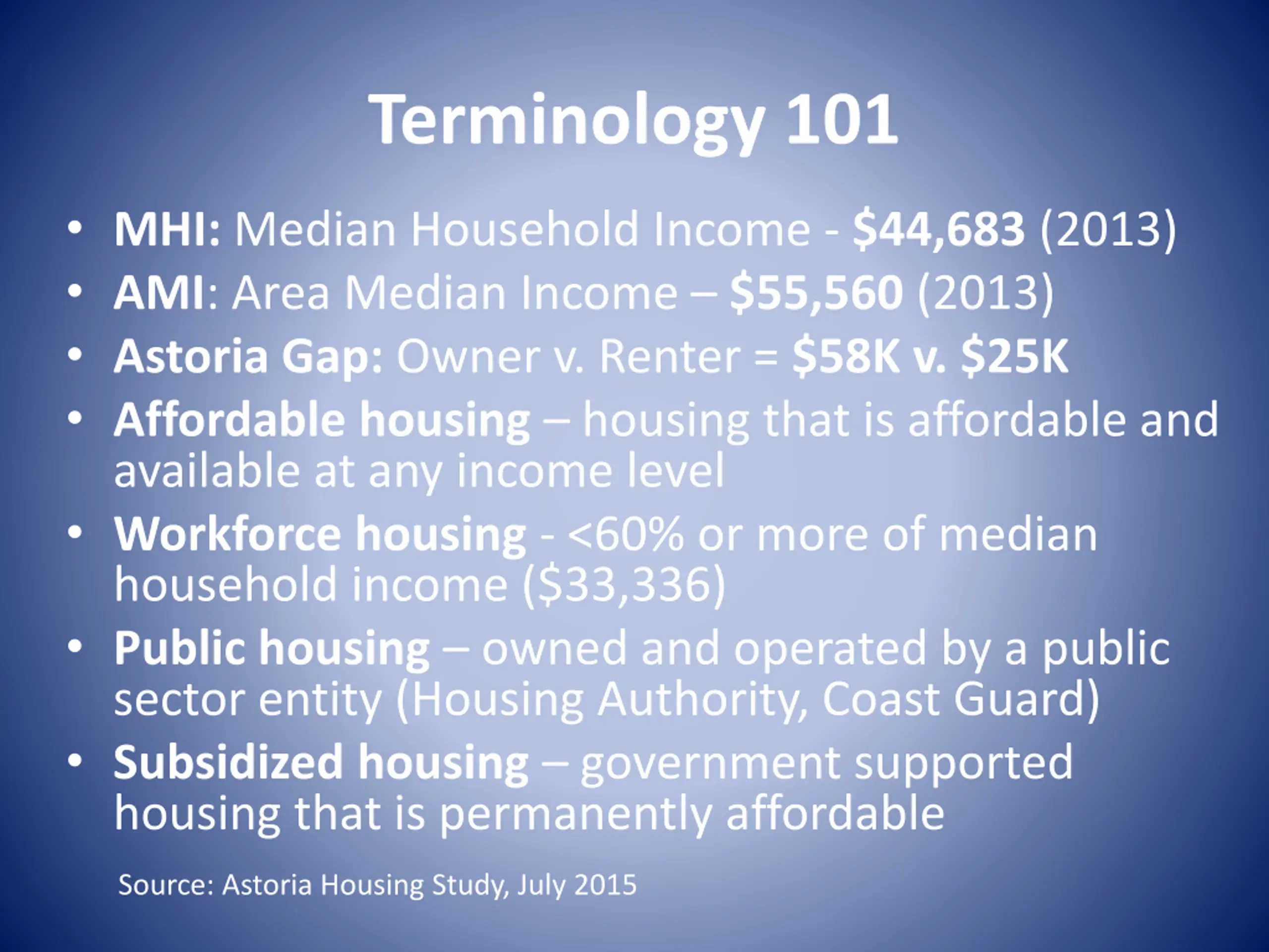 Terminology 101 MHI: Median Household Income - $44,683 (2013) AMI: Area Median Income $55,560 (2013) Astoria Gap: Owner v. Renter = $58K v. $25K Affordable housing housing that is affordable and available at any income level Workforce housing - <60% or more of median household income ($33,336) Public housing owned and operated by a public sector entity (Housing Authority, Coast Guard) Subsidized housing government supported housing that is permanently affordable Source: Astoria Housing Study, July 2015
