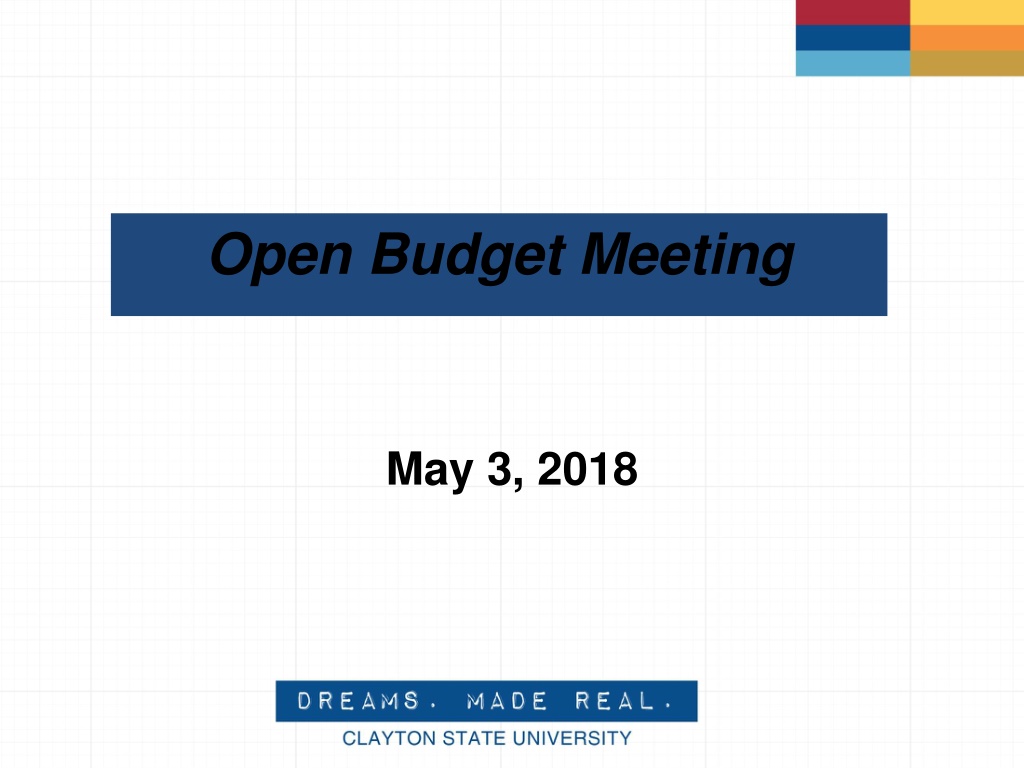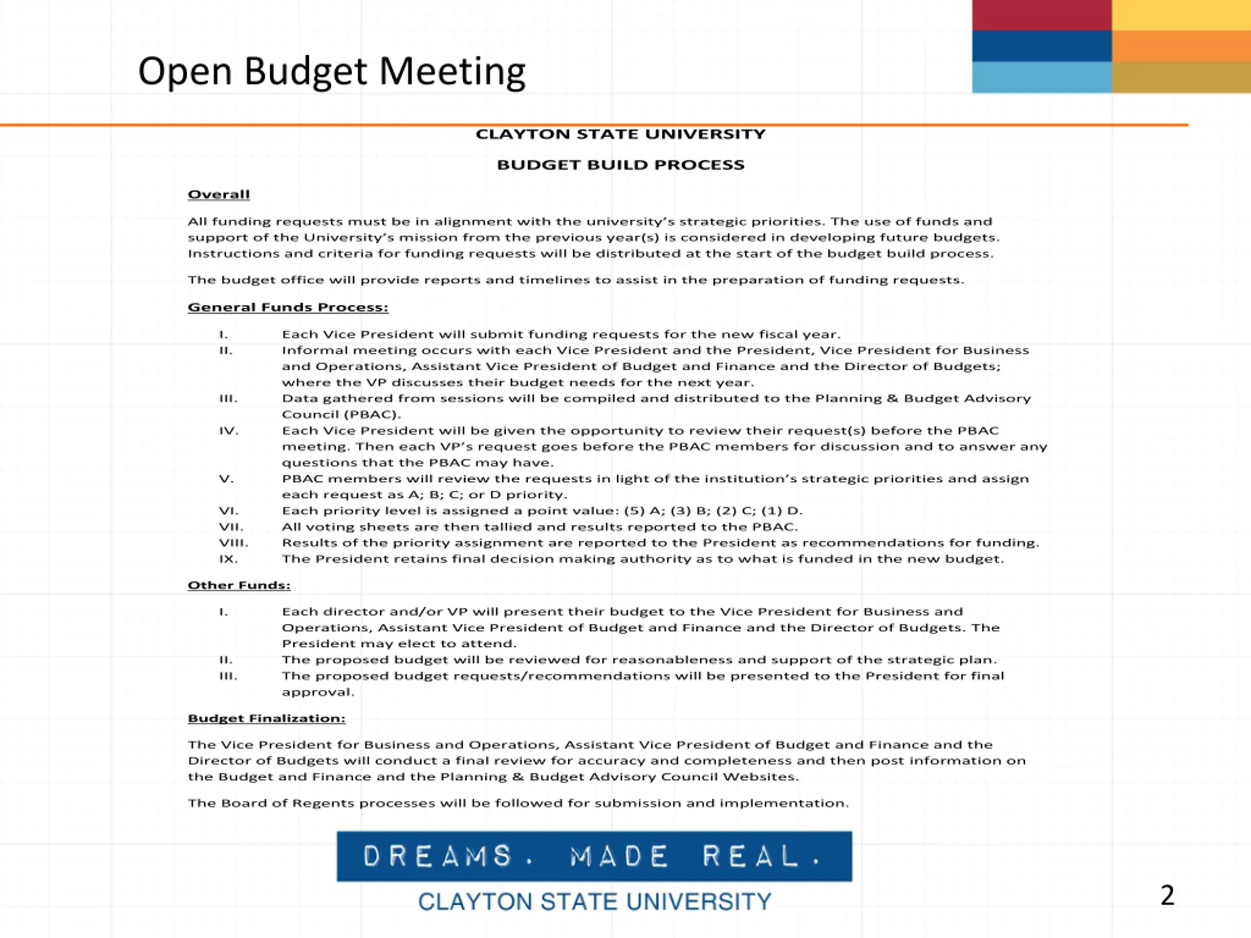 Open Budget Meeting CLAYTON STATE UNIVERSITY BUDGET BUILD PROCESS Overall All funding requests must be in alignment with the university s strategic priorities. The use of funds and support of the University s mission from the previous year(s) is considered in developing future budgets. Instructions and criteria for funding requests will be distributed at the start of the budget build process. The budget office will provide reports and timelines to assist in the preparation of funding requests. General Funds Process: I. II. Each Vice President will submit funding requests for the new fiscal year. Informal meeting occurs with each Vice President and the President, Vice President for Business and Operations, Assistant Vice President of Budget and Finance and the Director of Budgets; where the VP discusses their budget needs for the next year. Data gathered from sessions will be compiled and distributed to the Planning & Budget Advisory Council (PBAC). Each Vice President will be given the opportunity to review their request(s) before the PBAC meeting. Then each VP s request goes before the PBAC members for discussion and to answer any questions that the PBAC may have. PBAC members will review the requests in light of the institution s strategic priorities and assign each request as A; B; C; or D priority. Each priority level is assigned a point value: (5) A; (3) B; (2) C; (1) D. All voting sheets are then tallied and results reported to the PBAC. Results of the priority assignment are reported to the President as recommendations for funding. The President retains final decision making authority as to what is funded in the new budget. III. IV. V. VI. VII. VIII. IX. Other Funds: I. Each director and/or VP will present their budget to the Vice President for Business and Operations, Assistant Vice President of Budget and Finance and the Director of Budgets. The President may elect to attend. The proposed budget will be reviewed for reasonableness and support of the strategic plan. The proposed budget requests/recommendations will be presented to the President for final approval. II. III. Budget Finalization: The Vice President for Business and Operations, Assistant Vice President of Budget and Finance and the Director of Budgets will conduct a final review for accuracy and completeness and then post information on the Budget and Finance and the Planning & Budget Advisory Council Websites. The Board of Regents processes will be followed for submission and implementation. 2