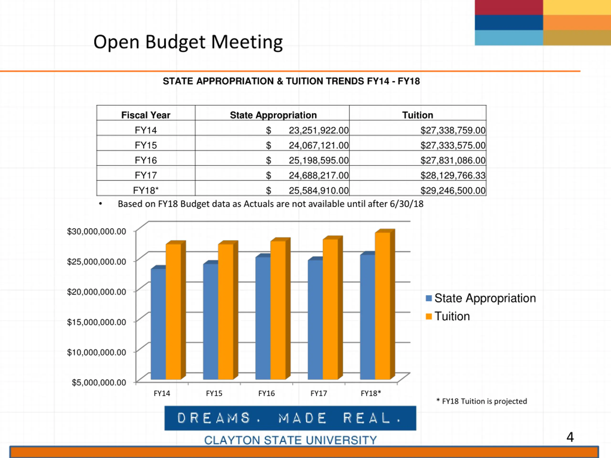 Clayton State Universitys Resources State Appropriation Tuition Institutional Fee and Course Fees 54.4% State* 2% Auxiliary Services & Student Life 18% 25% Continuing Education 45.6% Other Indirect Funds 1% 2% 0% Technology Restricted 17% MRR 29% 6% Restrictions Realities Uses Prudent fiscal management required for all sources State Appropriation varies Focus on Financial Ratios Economic conditions have a direct impact on our ability to collect the revenues necessary to satisfy the needs and obligations of the University *6% MRR excluded Salaries and Wages Utilities Supplies and Equipment Technology Facilities and Maintenance Public Safety Campus Activities and Services Capital funds can not be used to pay for salaries and wages State procurement guidelines must be followed Student fees must be used in conjunction with specific services 3