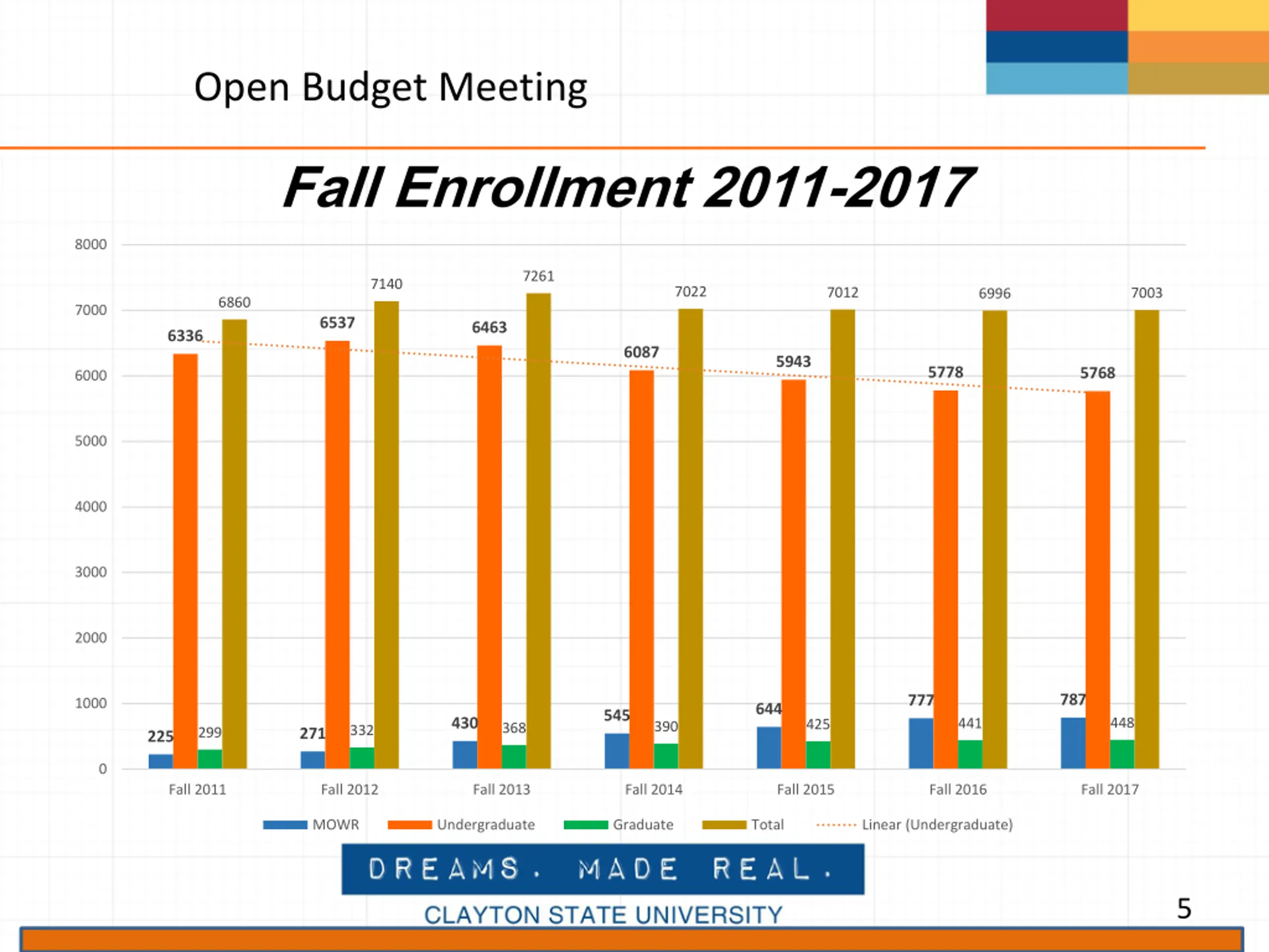 Open Budget Meeting Fall Enrollment 2011-2017 8000 7261 7140 7022 7012 7003 6996 6860 7000 6537 6463 6336 6087 5943 5778 5768 6000 5000 4000 3000 2000 787 777 1000 644 545 430 448 441 425 390 368 332 299 271 225 0 Fall 2011 Fall 2012 Fall 2013 Fall 2014 Fall 2015 Fall 2016 Fall 2017 MOWR Undergraduate Graduate Total Linear (Undergraduate) 5
