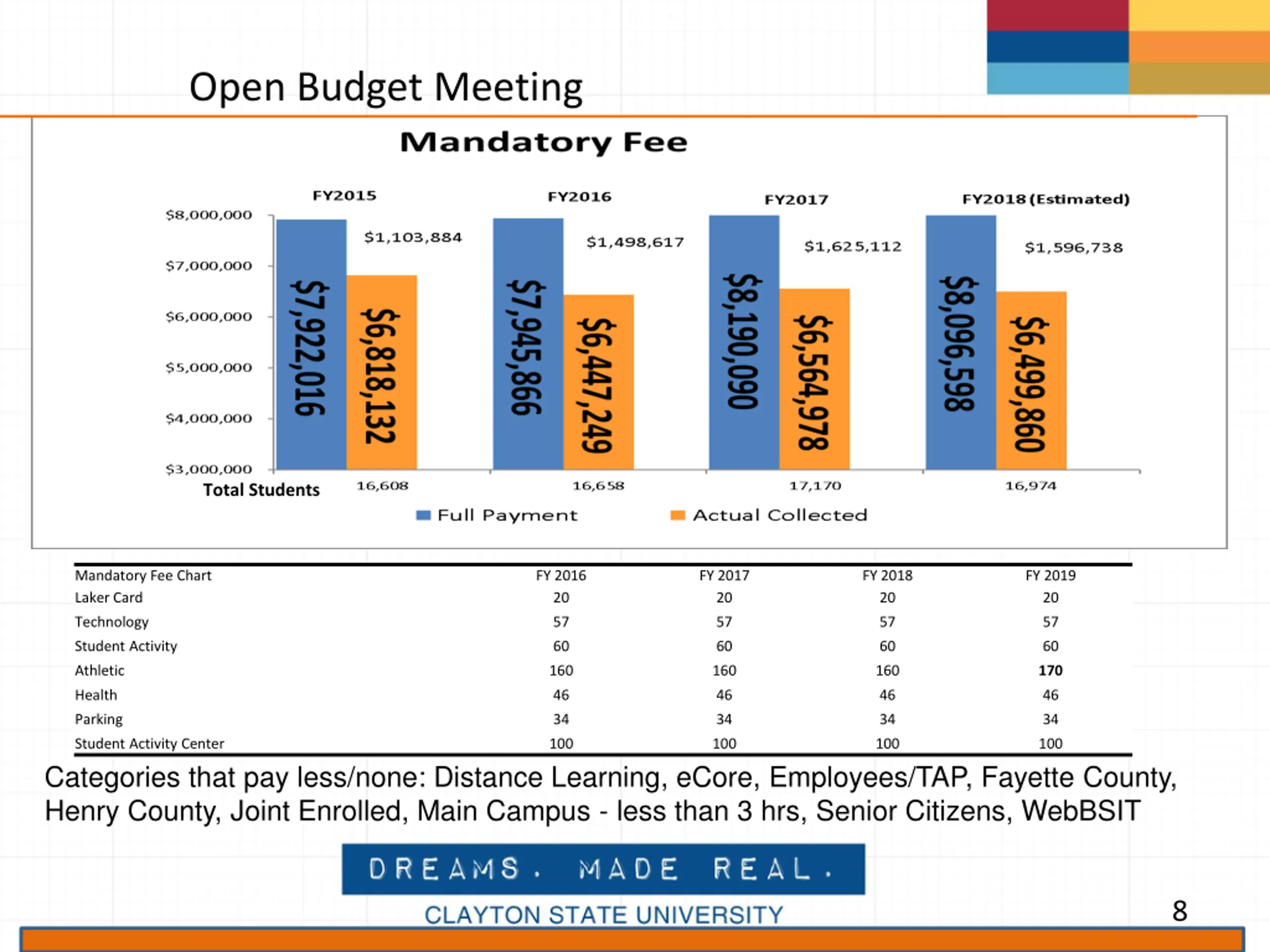 Open Budget Meeting Total Students Mandatory Fee Chart Laker Card FY 2016 20 FY 2017 20 FY 2018 20 FY 2019 20 Technology 57 57 57 57 Student Activity 60 60 60 60 Athletic 160 160 160 170 Health 46 46 46 46 Parking 34 34 34 34 Student Activity Center 100 100 100 100 Categories that pay less/none: Distance Learning, eCore, Employees/TAP, Fayette County, Henry County, Joint Enrolled, Main Campus - less than 3 hrs, Senior Citizens, WebBSIT 8