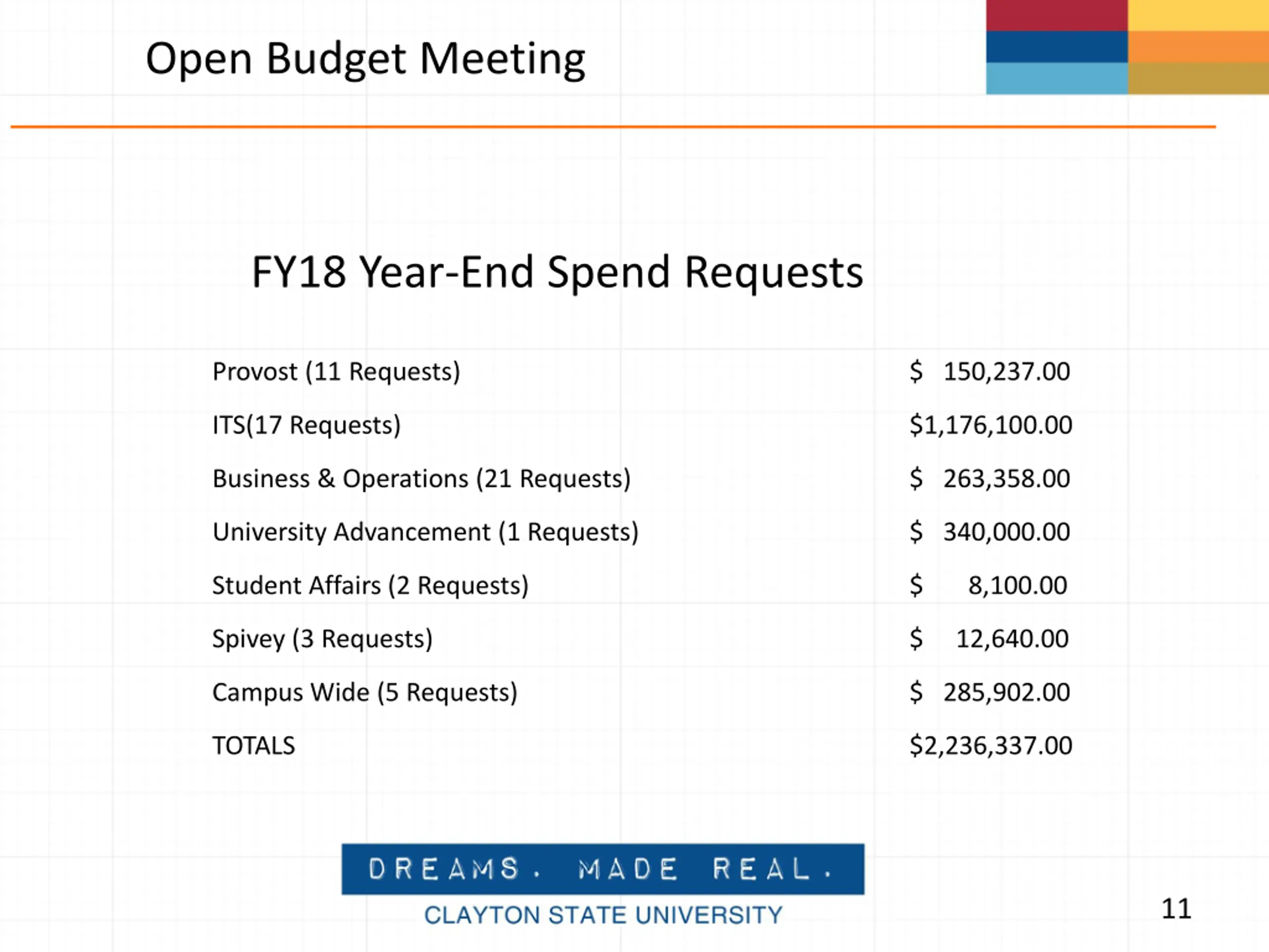 Open Budget Meeting FY18 Year-End Spend Requests Provost (11 Requests) $ 150,237.00 ITS(17 Requests) $1,176,100.00 Business & Operations (21 Requests) $ 263,358.00 University Advancement (1 Requests) $ 340,000.00 Student Affairs (2 Requests) $ 8,100.00 Spivey (3 Requests) $ 12,640.00 Campus Wide (5 Requests) $ 285,902.00 TOTALS $2,236,337.00 11