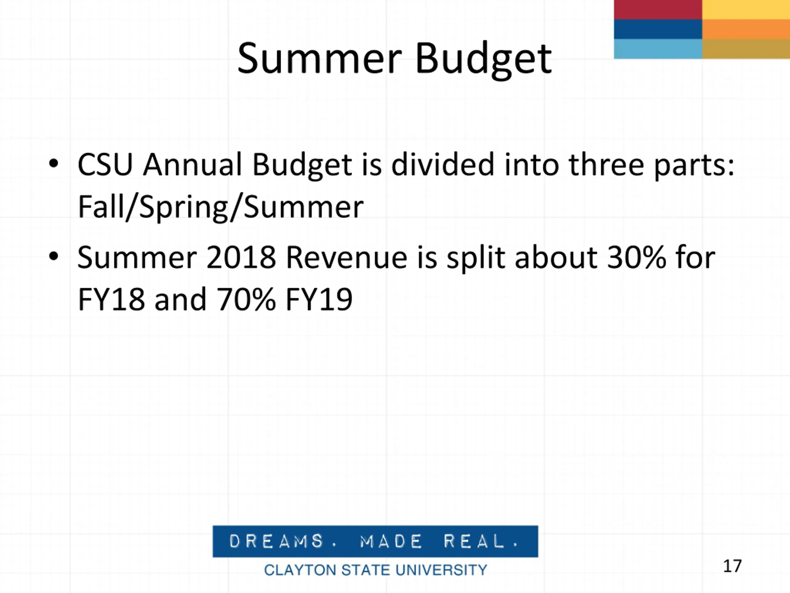 Summer Budget CSU Annual Budget is divided into three parts: Fall/Spring/Summer Summer 2018 Revenue is split about 30% for FY18 and 70% FY19 17