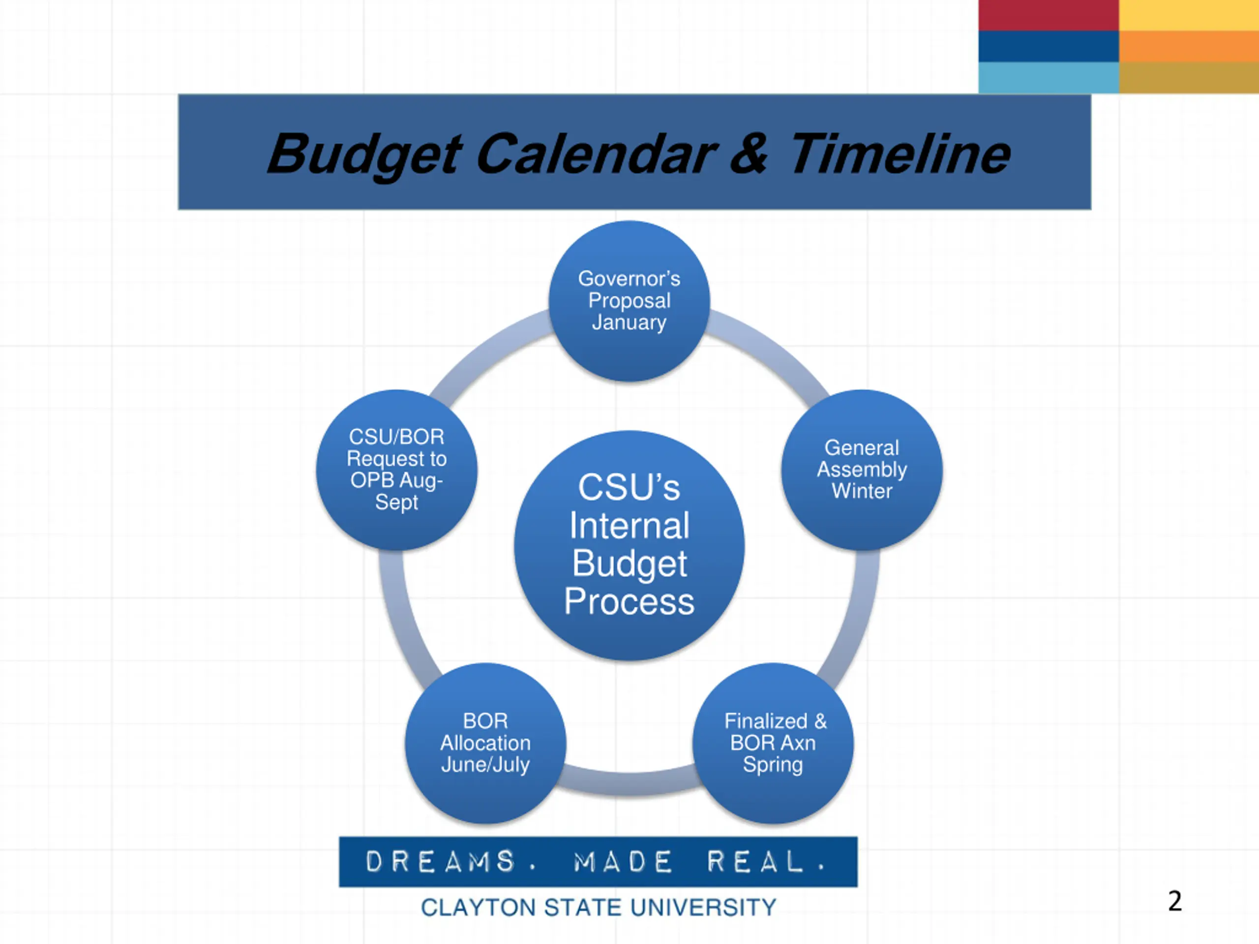 Budget Calendar & Timeline Governor s Proposal January CSU/BOR Request to OPB Aug- Sept General Assembly Winter CSU s Internal Budget Process BOR Allocation June/July Finalized & BOR Axn Spring 2