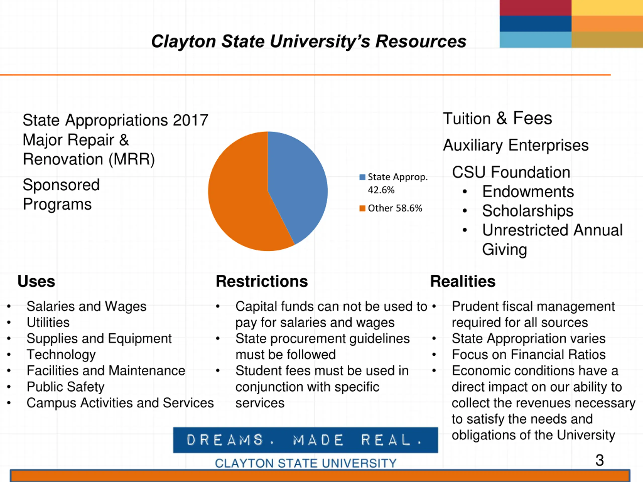 Clayton State Universitys Resources Tuition & Fees Auxiliary Enterprises StateAppropriations 2017 Major Repair & Renovation (MRR) Sponsored Programs CSU Foundation Endowments Scholarships Unrestricted Annual Giving State Approp. 42.6% Other 58.6% Uses Restrictions Realities Salaries and Wages Utilities Supplies and Equipment Technology Facilities and Maintenance Public Safety Campus Activities and Services Capital funds can not be used to pay for salaries and wages State procurement guidelines must be followed Student fees must be used in conjunction with specific services Prudent fiscal management required for all sources State Appropriation varies Focus on Financial Ratios Economic conditions have a direct impact on our ability to collect the revenues necessary to satisfy the needs and obligations of the University 3