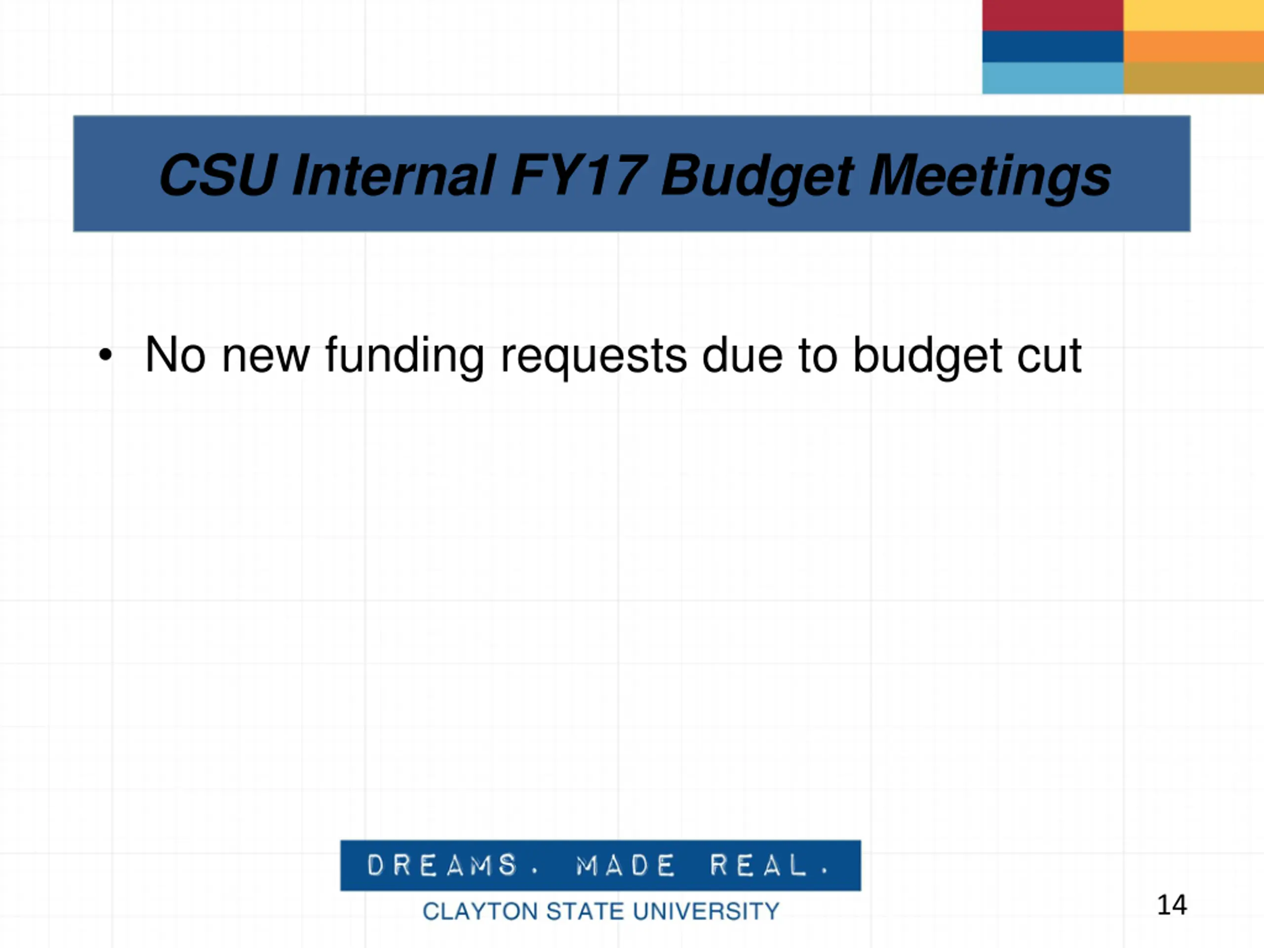 CSU Internal FY17 Budget Meetings No new funding requests due to budget cut 14