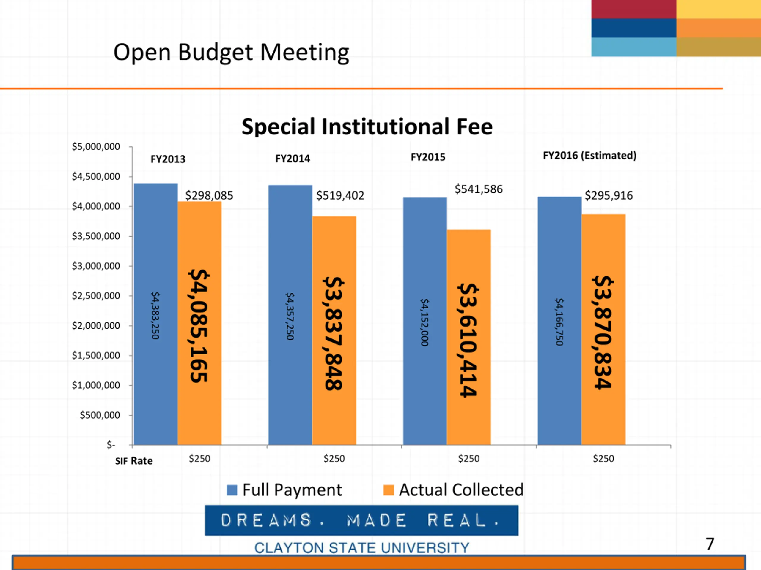 Open Budget Meeting Special Institutional Fee $5,000,000 FY2016 (Estimated) FY2015 FY2014 FY2013 $4,500,000 $541,586 $295,916 $298,085 $519,402 $4,000,000 $3,500,000 $3,000,000 $4,085,165 $3,870,834 $3,837,848 $3,610,414 $2,500,000 $4,383,250 $4,357,250 $4,166,750 $4,152,000 $2,000,000 $1,500,000 $1,000,000 $500,000 $- $250 $250 $250 $250 SIF Rate Full Payment Actual Collected 7