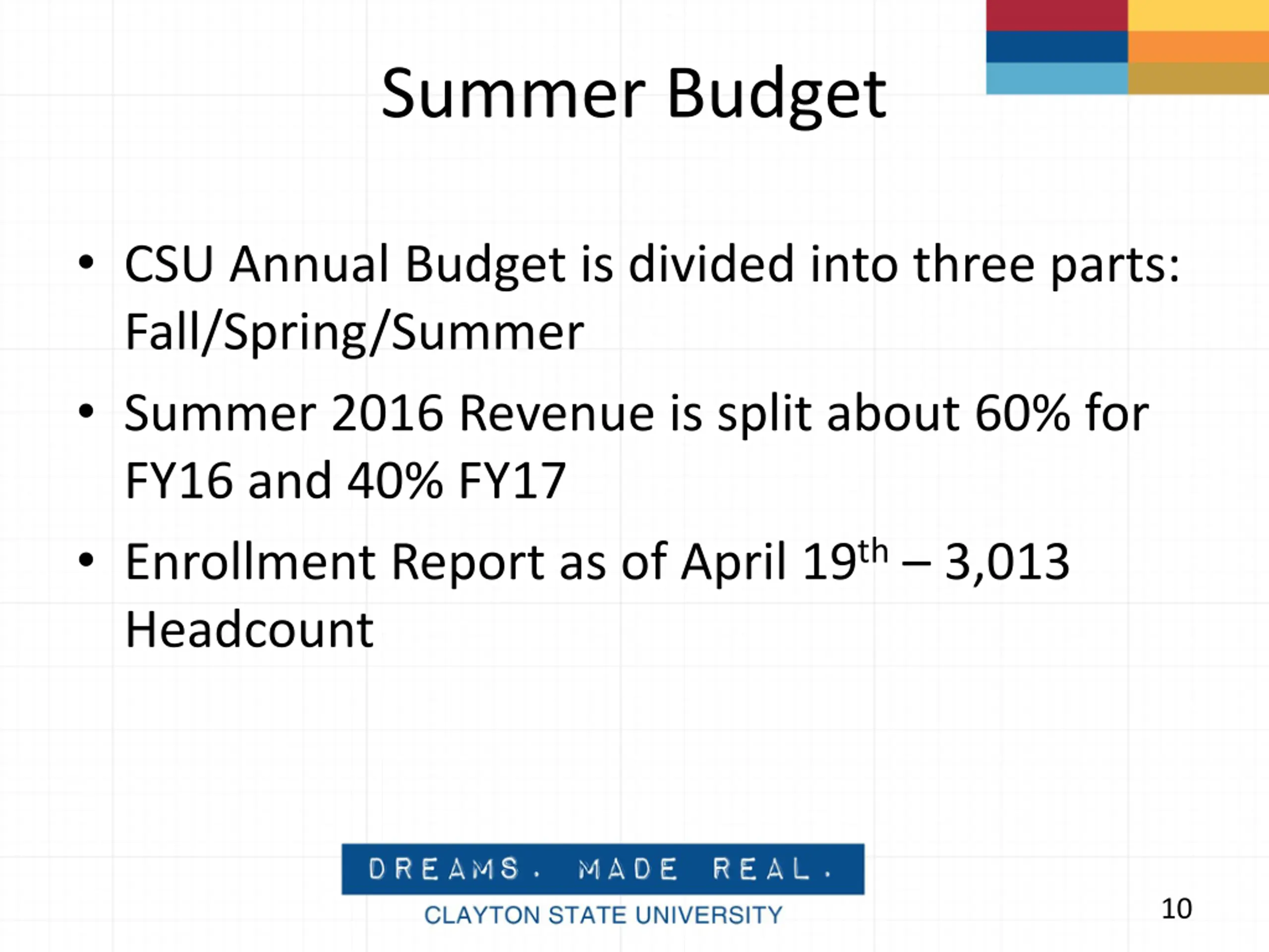 Summer Budget CSU Annual Budget is divided into three parts: Fall/Spring/Summer Summer 2016 Revenue is split about 60% for FY16 and 40% FY17 Enrollment Report as of April 19th 3,013 Headcount 10