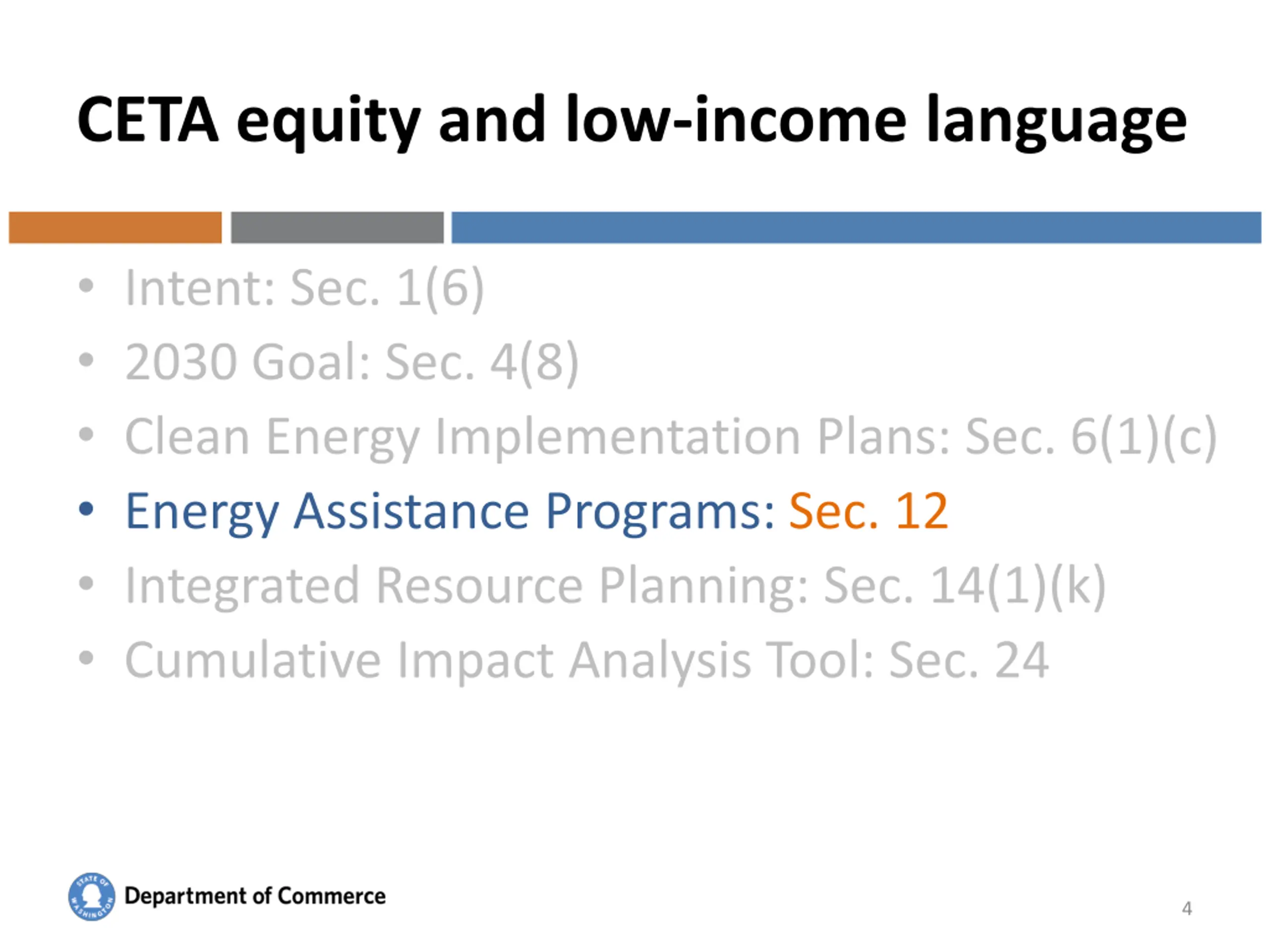 CETA equity and low-income language Intent: Sec. 1(6) 2030 Goal: Sec. 4(8) Clean Energy Implementation Plans: Sec. 6(1)(c) Energy Assistance Programs: Sec. 12 Integrated Resource Planning: Sec. 14(1)(k) Cumulative Impact Analysis Tool: Sec. 24 Where do you see touchpoints with your work? Washington State Department of Commerce 3