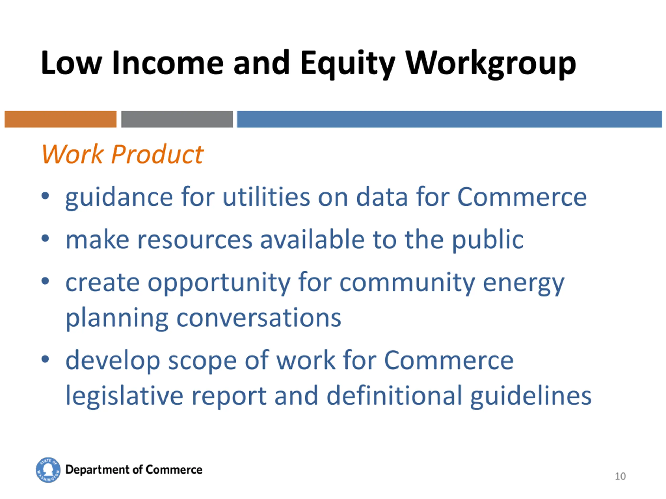 Low Income and Equity Workgroup Work Product guidance for utilities on data for Commerce make resources available to the public create opportunity for community energy planning conversations develop scope of work for Commerce legislative report and definitional guidelines Washington State Department of Commerce 10