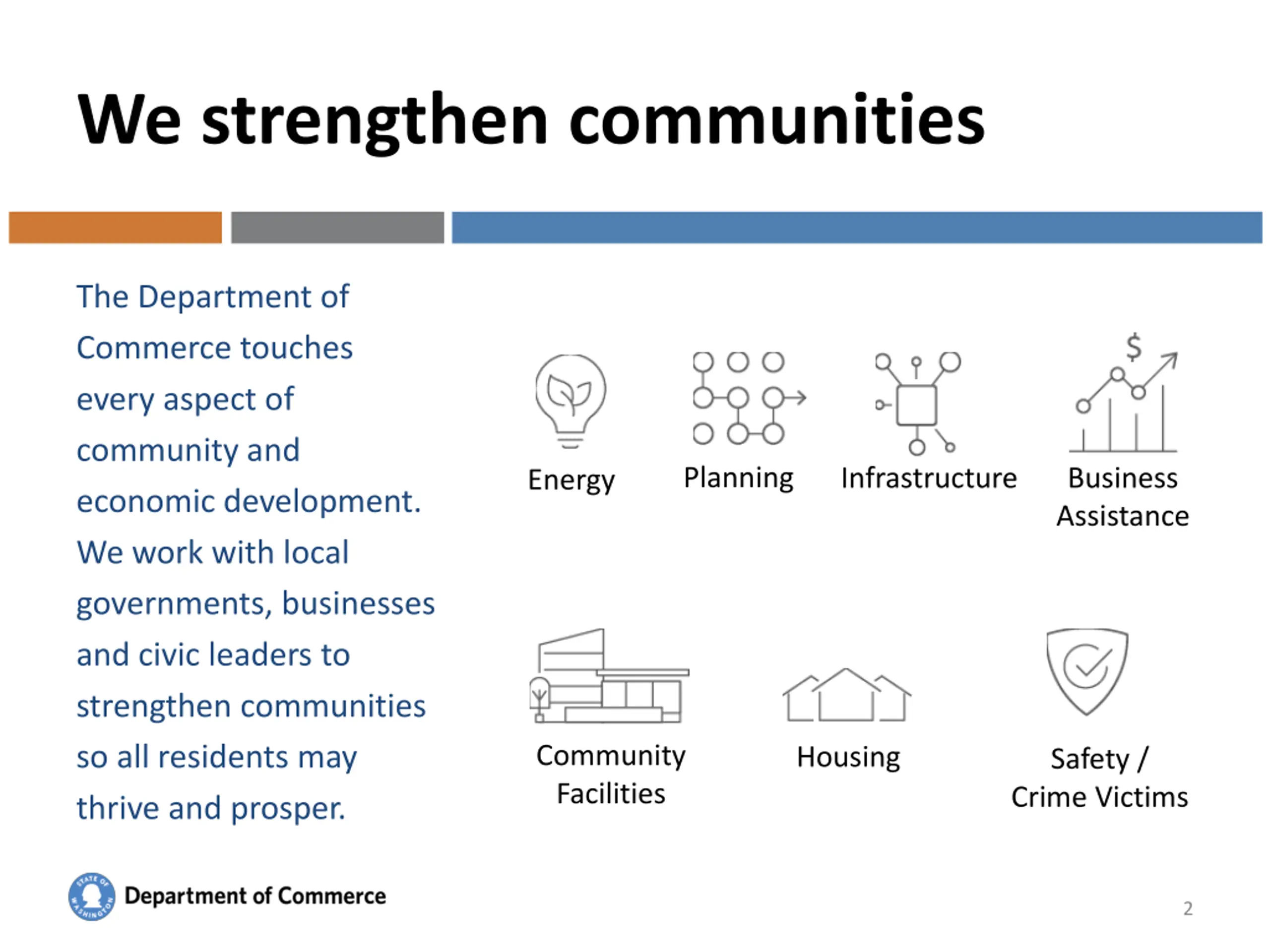 We strengthen communities The Department of Commerce touches every aspect of community and economic development. We work with local governments, businesses and civic leaders to strengthen communities so all residents may thrive and prosper. Planning Business Assistance Infrastructure Energy Community Facilities Housing Safety / Crime Victims Washington State Department of Commerce 2