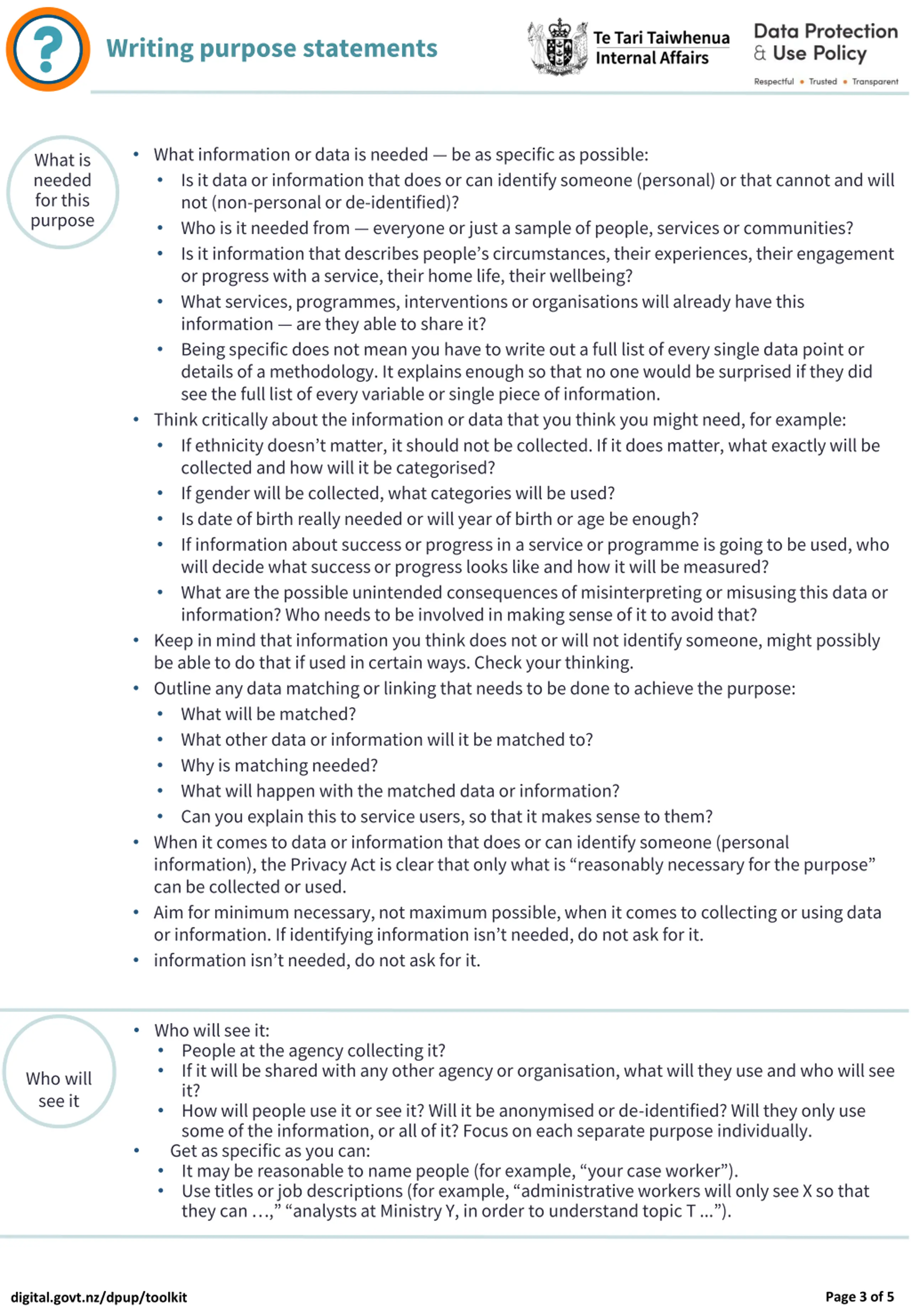 Writing purpose statements What information or data is needed be as specific as possible: Is it data or information that does or can identify someone (personal) or that cannot and will not (non-personal or de-identified)? Who is it needed from everyone or just a sample of people, services or communities? Is it information that describes people s circumstances, their experiences, their engagement or progress with a service, their home life, their wellbeing? What services, programmes, interventions or organisations will already have this information are they able to share it? Being specific does not mean you have to write out a full list of every single data point or details of a methodology. It explains enough so that no one would be surprised if they did see the full list of every variable or single piece of information. Think critically about the information or data that you think you might need, for example: If ethnicity doesn t matter, it should not be collected. If it does matter, what exactly will be collected and how will it be categorised? If gender will be collected, what categories will be used? Is date of birth really needed or will year of birth or age be enough? If information about success or progress in a service or programme is going to be used, who will decide what success or progress looks like and how it will be measured? What are the possible unintended consequences of misinterpreting or misusing this data or information? Who needs to be involved in making sense of it to avoid that? Keep in mind that information you think does not or will not identify someone, might possibly be able to do that if used in certain ways. Check your thinking. Outline any data matching or linking that needs to be done to achieve the purpose: What will be matched? What other data or information will it be matched to? Why is matching needed? What will happen with the matched data or information? Can you explain this to service users, so that it makes sense to them? When it comes to data or information that does or can identify someone (personal information), the Privacy Act is clear that only what is reasonably necessary for the purpose can be collected or used. Aim for minimum necessary, not maximum possible, when it comes to collecting or using data or information. If identifying information isn t needed, do not ask for it. information isn t needed, do not ask for it. What is needed for this purpose Who will see it: People at the agency collecting it? If it will be shared with any other agency or organisation, what will they use and who will see it? How will people use it or see it? Will it be anonymised or de-identified? Will they only use some of the information, or all of it? Focus on each separate purpose individually. Get as specific as you can: It may be reasonable to name people (for example, your case worker ). Use titles or job descriptions (for example, administrative workers will only see X so that they can , analysts at Ministry Y, in order to understand topic T ... ). Who will see it Page 3 of 5 digital.govt.nz/dpup/toolkit