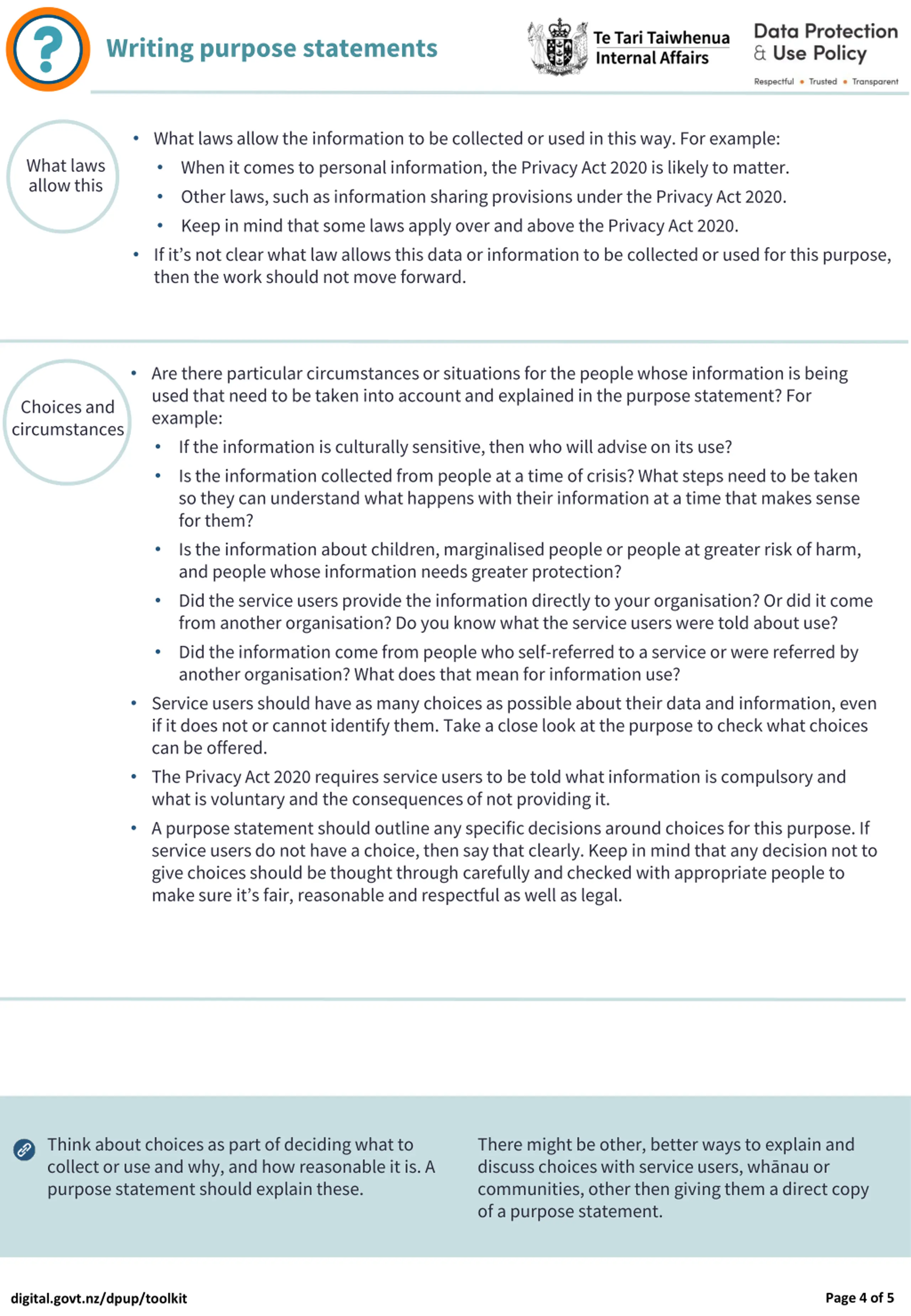 Writing purpose statements What laws allow the information to be collected or used in this way. For example: When it comes to personal information, the Privacy Act 2020 is likely to matter. Other laws, such as information sharing provisions under the Privacy Act 2020. Keep in mind that some laws apply over and above the Privacy Act 2020. If it s not clear what law allows this data or information to be collected or used for this purpose, then the work should not move forward. What laws allow this Are there particular circumstances or situations for the people whose information is being used that need to be taken into account and explained in the purpose statement? For example: If the information is culturally sensitive, then who will advise on its use? Is the information collected from people at a time of crisis? What steps need to be taken so they can understand what happens with their information at a time that makes sense for them? Is the information about children, marginalised people or people at greater risk of harm, and people whose information needs greater protection? Did the service users provide the information directly to your organisation? Or did it come from another organisation? Do you know what the service users were told about use? Did the information come from people who self-referred to a service or were referred by another organisation? What does that mean for information use? Service users should have as many choices as possible about their data and information, even if it does not or cannot identify them. Take a close look at the purpose to check what choices can be offered. The Privacy Act 2020 requires service users to be told what information is compulsory and what is voluntary and the consequences of not providing it. A purpose statement should outline any specific decisions around choices for this purpose. If service users do not have a choice, then say that clearly. Keep in mind that any decision not to give choices should be thought through carefully and checked with appropriate people to make sure it s fair, reasonable and respectful as well as legal. Choices and circumstances Think about choices as part of deciding what to collect or use and why, and how reasonable it is. A purpose statement should explain these. There might be other, better ways to explain and discuss choices with service users, wh nau or communities, other then giving them a direct copy of a purpose statement. Page 4 of 5 digital.govt.nz/dpup/toolkit