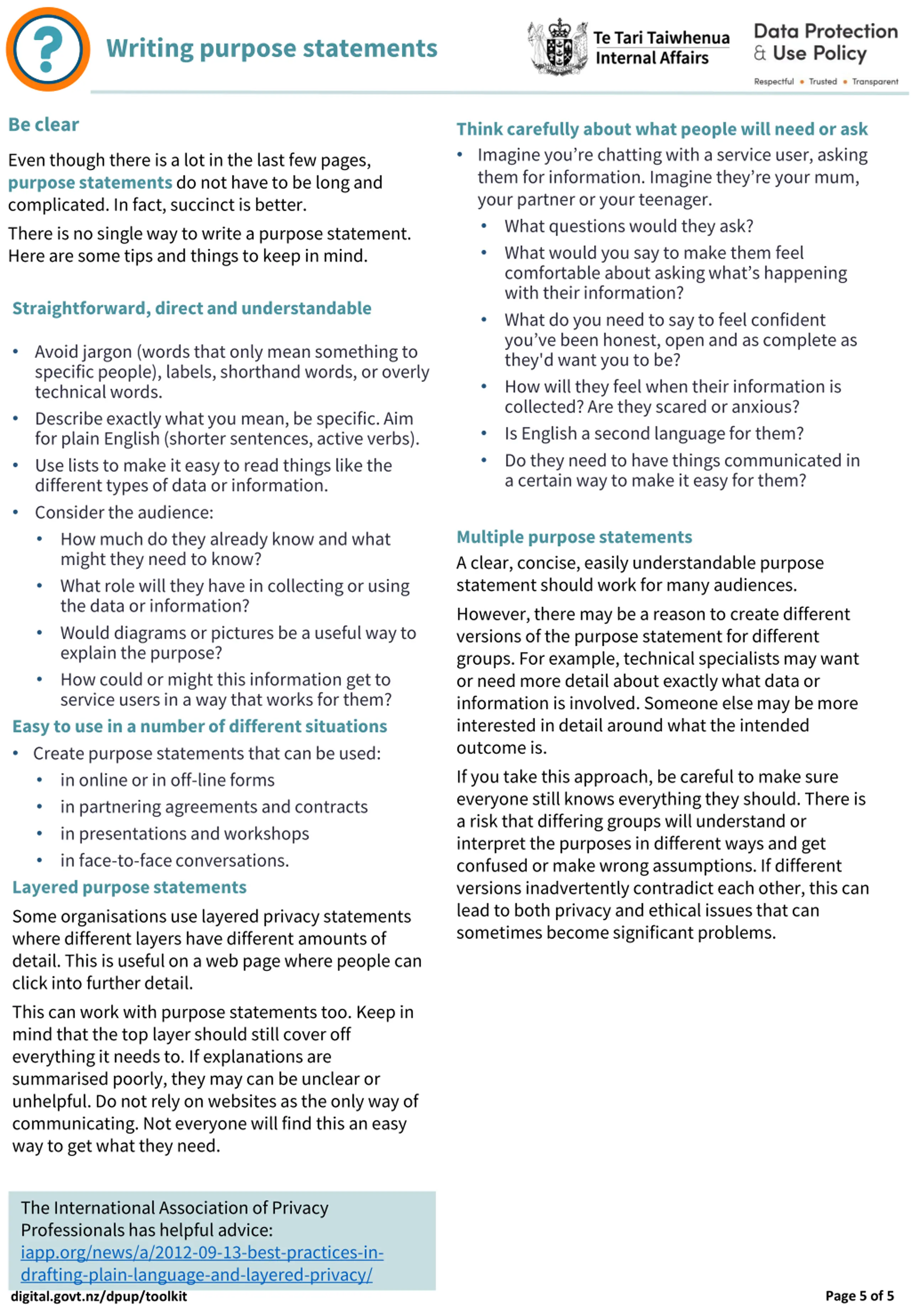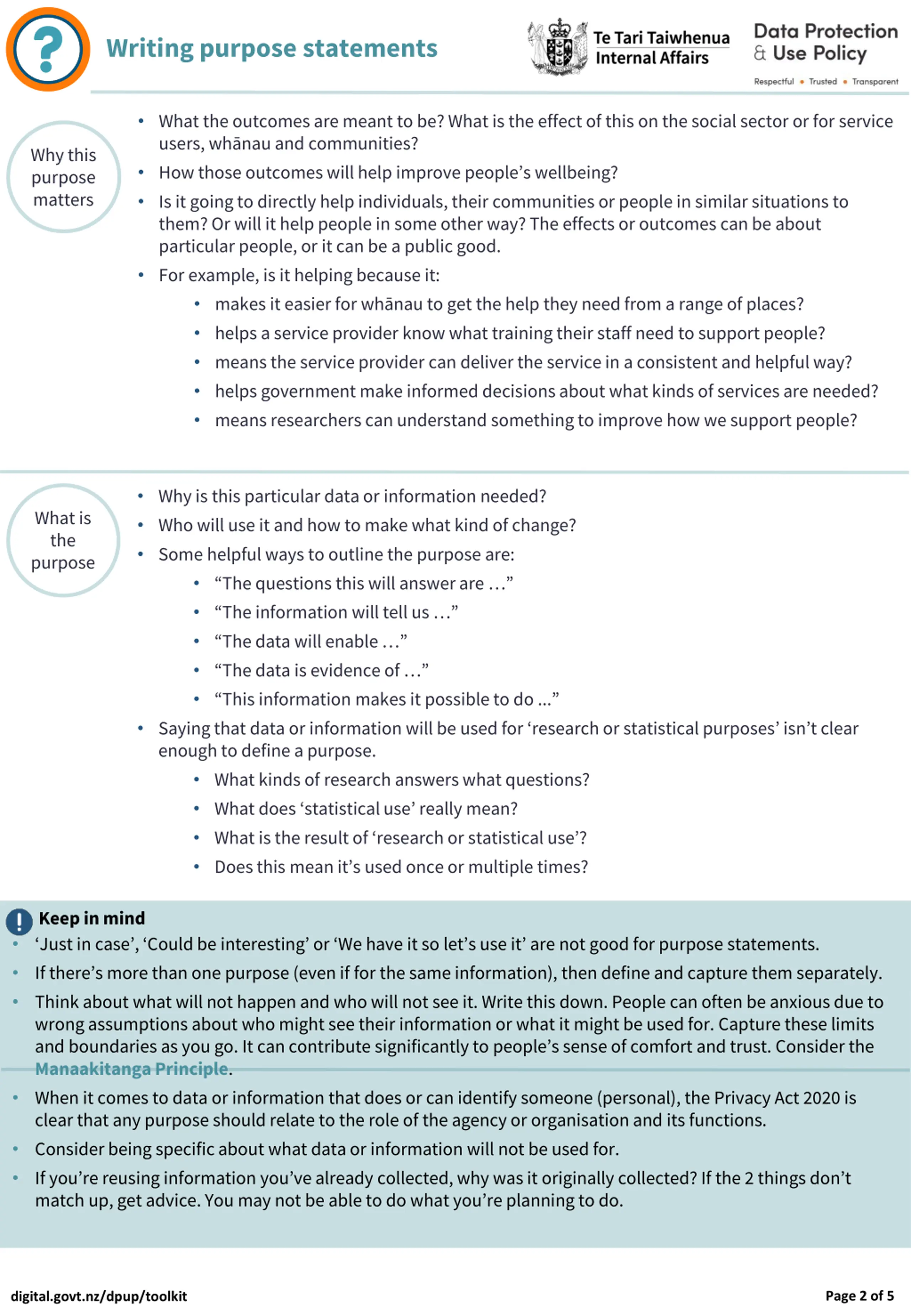 Writing purpose statements What the outcomes are meant to be? What is the effect of this on the social sector or for service users, wh nau and communities? How those outcomes will help improve people s wellbeing? Is it going to directly help individuals, their communities or people in similar situations to them? Or will it help people in some other way? The effects or outcomes can be about particular people, or it can be a public good. For example, is it helping because it: makes it easier for wh nau to get the help they need from a range of places? helps a service provider know what training their staff need to support people? means the service provider can deliver the service in a consistent and helpful way? helps government make informed decisions about what kinds of services are needed? means researchers can understand something to improve how we support people? Why this purpose matters Why is this particular data or information needed? Who will use it and how to make what kind of change? Some helpful ways to outline the purpose are: The questions this will answer are The information will tell us The data will enable The data is evidence of This information makes it possible to do ... Saying that data or information will be used for research or statistical purposes isn t clear enough to define a purpose. What kinds of research answers what questions? What does statistical use really mean? What is the result of research or statistical use ? Does this mean it s used once or multiple times? What is the purpose Keep in mind Just in case , Could be interesting or We have it so let s use it are not good for purpose statements. If there s more than one purpose (even if for the same information), then define and capture them separately. Think about what will not happen and who will not see it. Write this down. People can often be anxious due to wrong assumptions about who might see their information or what it might be used for. Capture these limits and boundaries as you go. It can contribute significantly to people s sense of comfort and trust. Consider the Manaakitanga Principle. When it comes to data or information that does or can identify someone (personal), the Privacy Act 2020 is clear that any purpose should relate to the role of the agency or organisation and its functions. Consider being specific about what data or information will not be used for. If you re reusing information you ve already collected, why was it originally collected? If the 2 things don t match up, get advice. You may not be able to do what you re planning to do. Page 2 of 5 digital.govt.nz/dpup/toolkit