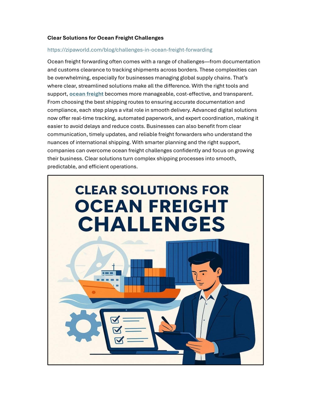 Clear Solutions for Ocean Freight Challenges https://zipaworld.com/blog/challenges-in-ocean-freight-forwarding Ocean freight forwarding often comes with a range of challenges from documentation and customs clearance to tracking shipments across borders. These complexities can be overwhelming, especially for businesses managing global supply chains. That s where clear, streamlined solutions make all the di?erence. With the right tools and support, ocean freight becomes more manageable, cost-e?ective, and transparent. From choosing the best shipping routes to ensuring accurate documentation and compliance, each step plays a vital role in smooth delivery. Advanced digital solutions now o?er real-time tracking, automated paperwork, and expert coordination, making it easier to avoid delays and reduce costs. Businesses can also benefit from clear communication, timely updates, and reliable freight forwarders who understand the nuances of international shipping. With smarter planning and the right support, companies can overcome ocean freight challenges confidently and focus on growing their business. Clear solutions turn complex shipping processes into smooth, predictable, and e?icient operations.