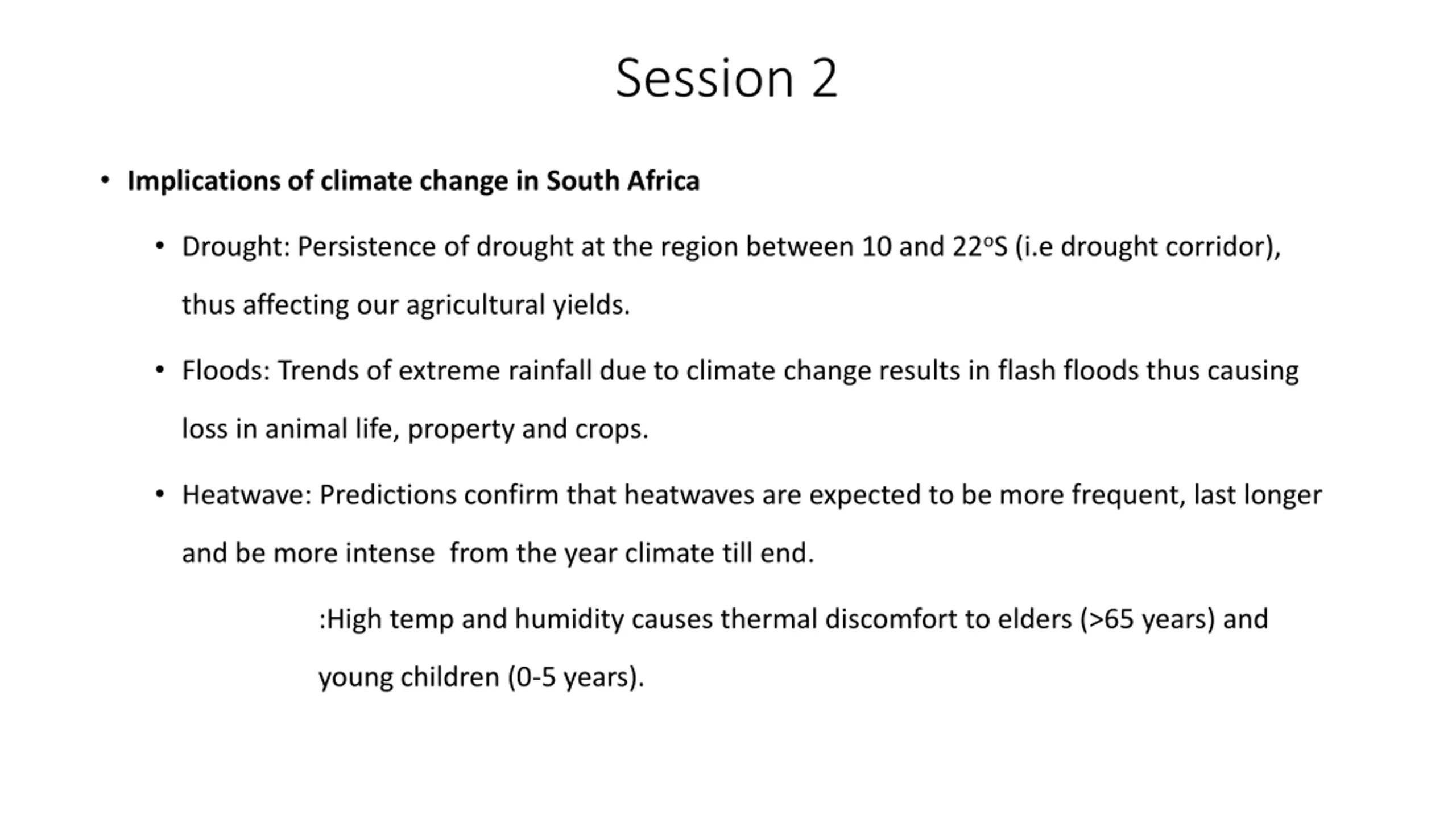 Session 2 Implications of climate change in South Africa Drought: Persistence of drought at the region between 10 and 22oS (i.e drought corridor), thus affecting our agricultural yields. Floods: Trends of extreme rainfall due to climate change results in flash floods thus causing loss in animal life, property and crops. Heatwave: Predictions confirm that heatwaves are expected to be more frequent, last longer and be more intense from the year climate till end. :High temp and humidity causes thermal discomfort to elders (>65 years) and young children (0-5 years).