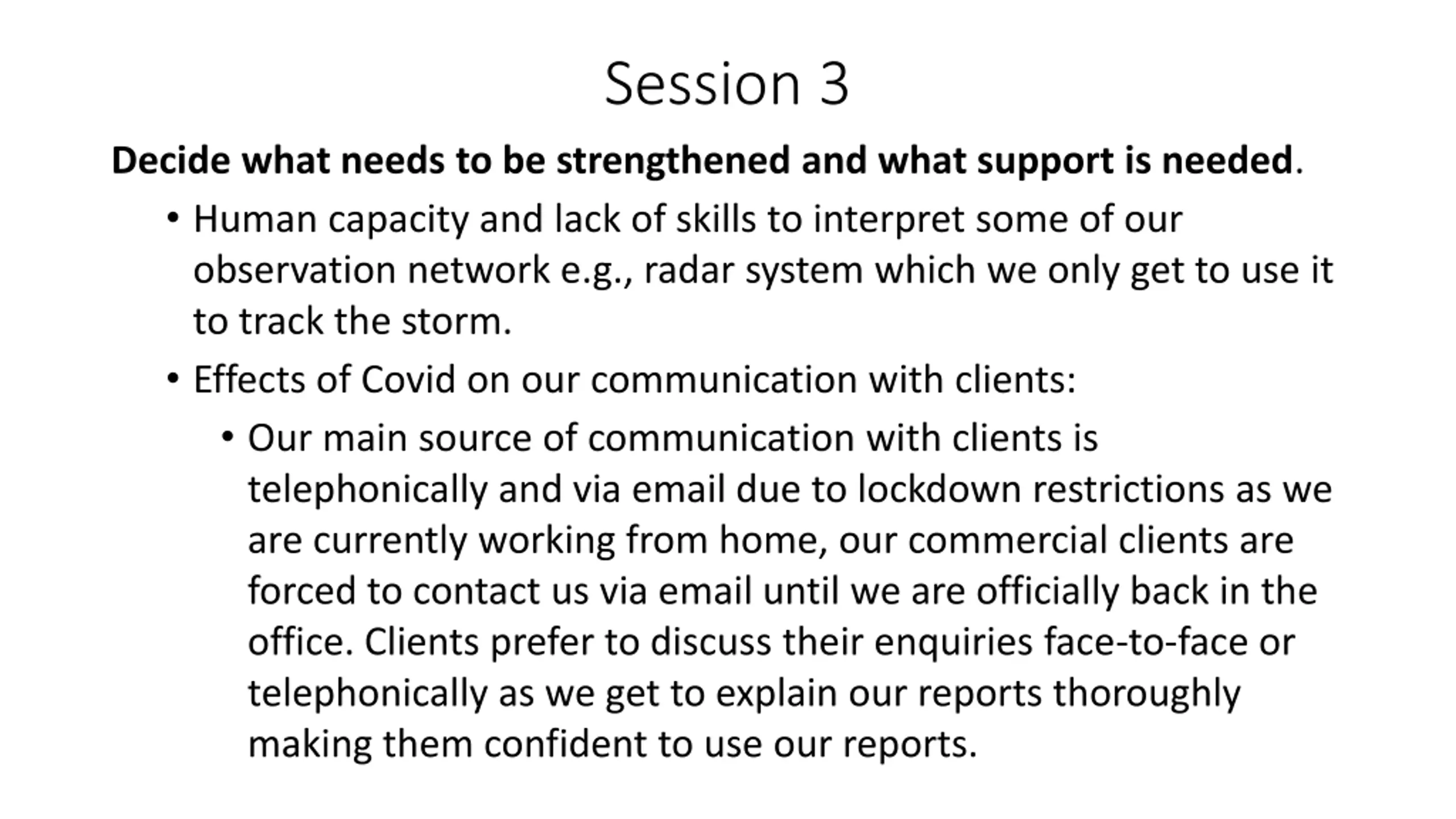 Session 3 Decide what needs to be strengthened and what support is needed. Human capacity and lack of skills to interpret some of our observation network e.g., radar system which we only get to use it to track the storm. Effects of Covid on our communication with clients: Our main source of communication with clients is telephonically and via email due to lockdown restrictions as we are currently working from home, our commercial clients are forced to contact us via email until we are officially back in the office. Clients prefer to discuss their enquiries face-to-face or telephonically as we get to explain our reports thoroughly making them confident to use our reports.
