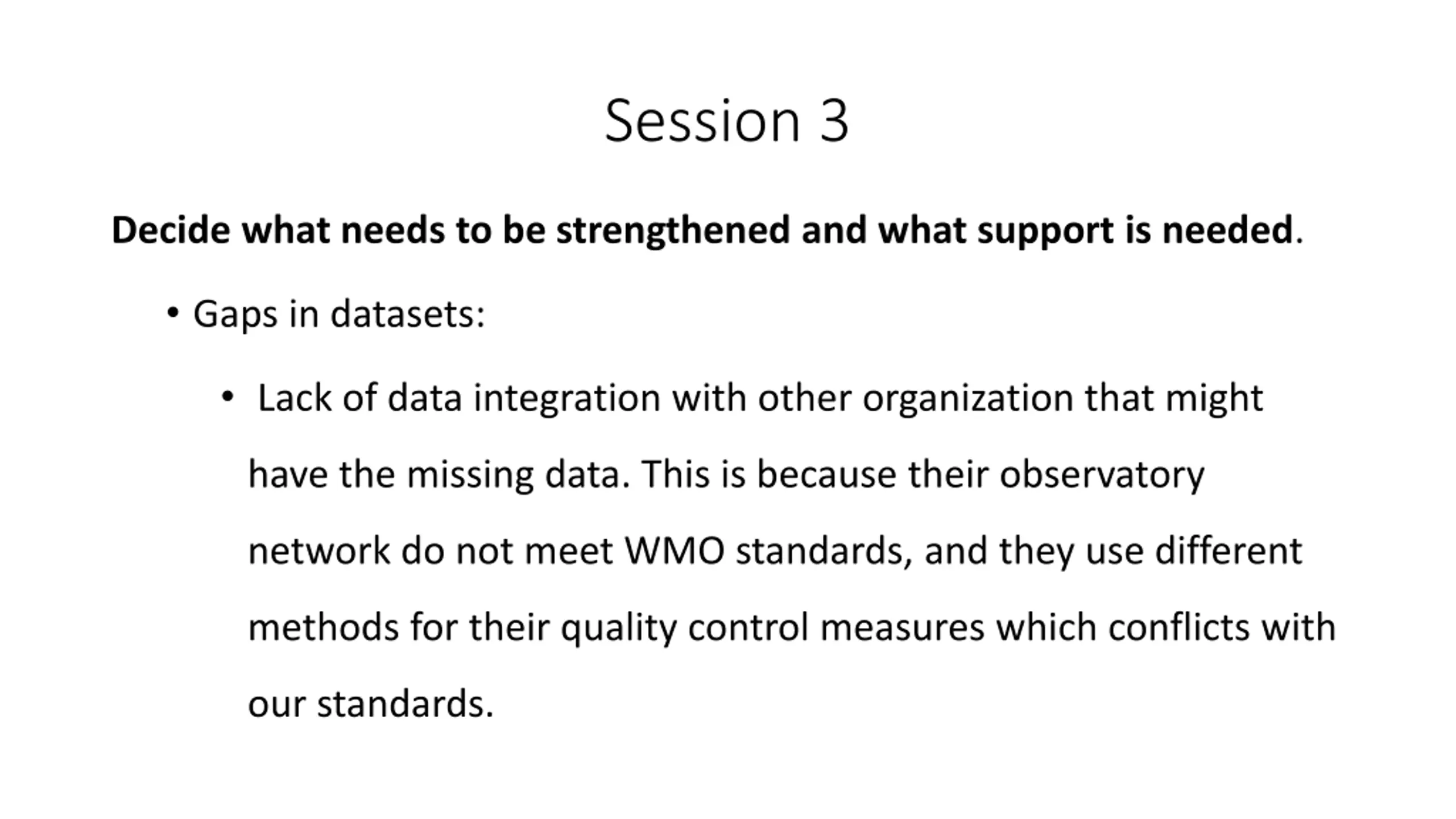 Session 3 Decide what needs to be strengthened and what support is needed. Gaps in datasets: Lack of data integration with other organization that might have the missing data. This is because their observatory network do not meet WMO standards, and they use different methods for their quality control measures which conflicts with our standards.
