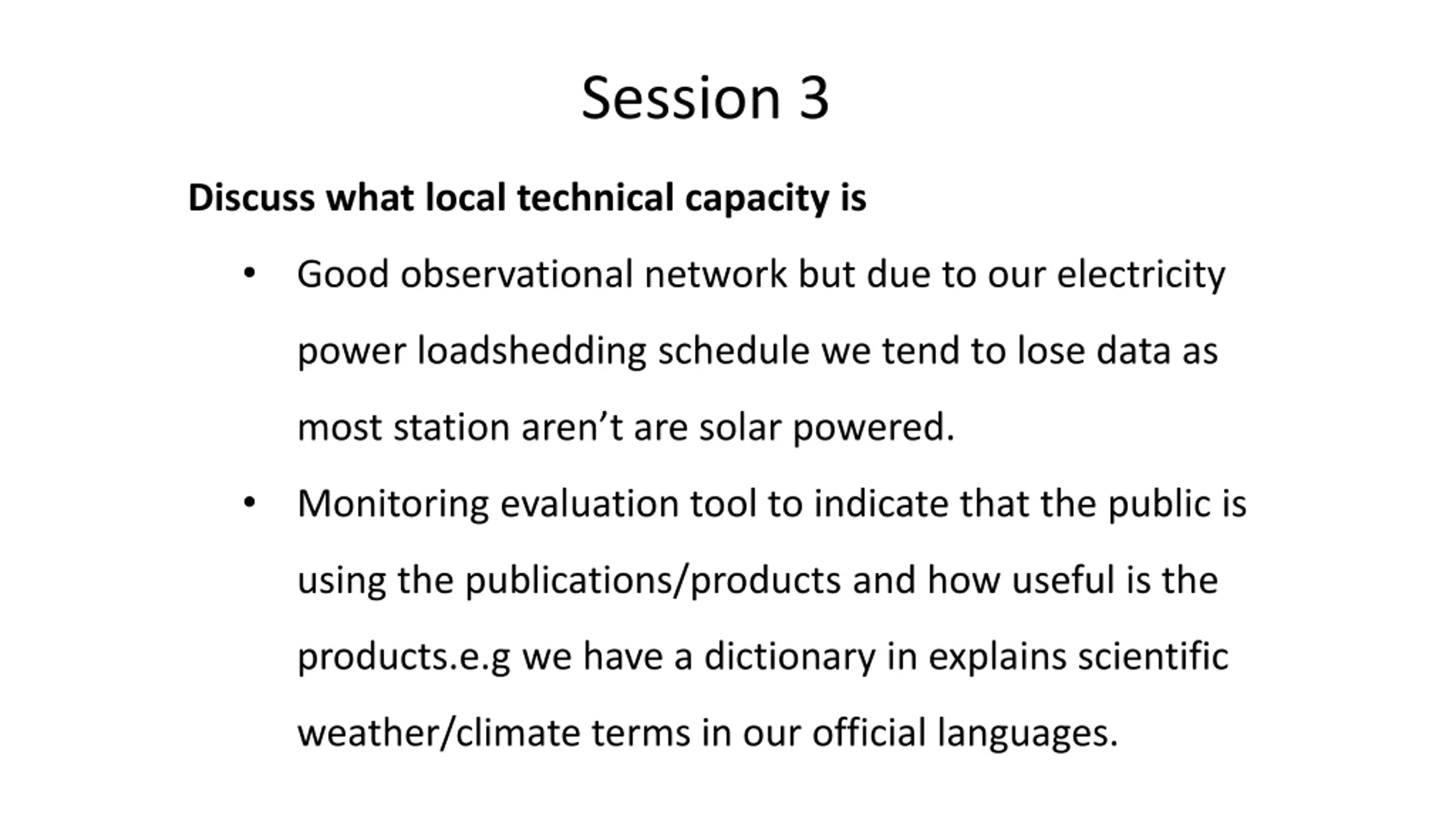 Session 3 Discuss what local technical capacity is Good observational network but due to our electricity power loadshedding schedule we tend to lose data as most station aren t are solar powered. Monitoring evaluation tool to indicate that the public is using the publications/products and how useful is the products.e.g we have a dictionary in explains scientific weather/climate terms in our official languages.