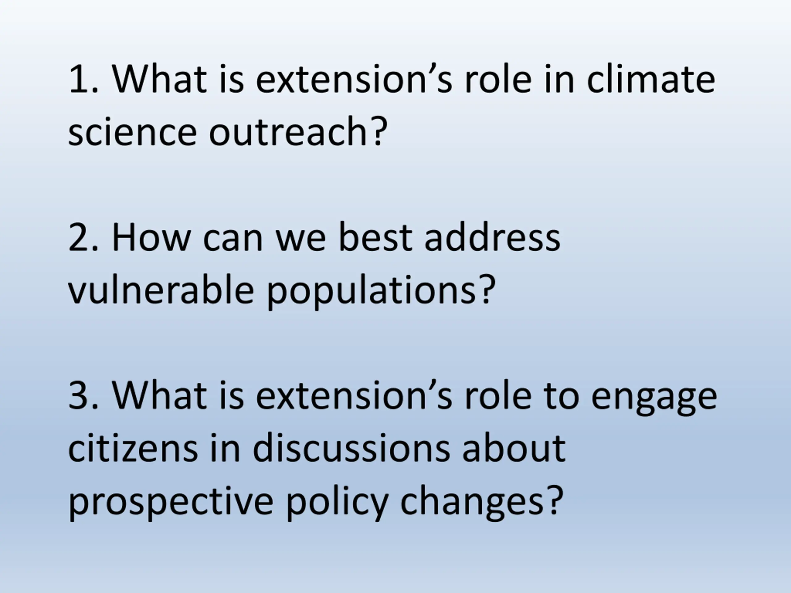 1. What is extensions role in climate science outreach? 2. How can we best address vulnerable populations? 3. What is extension s role to engage citizens in discussions about prospective policy changes?
