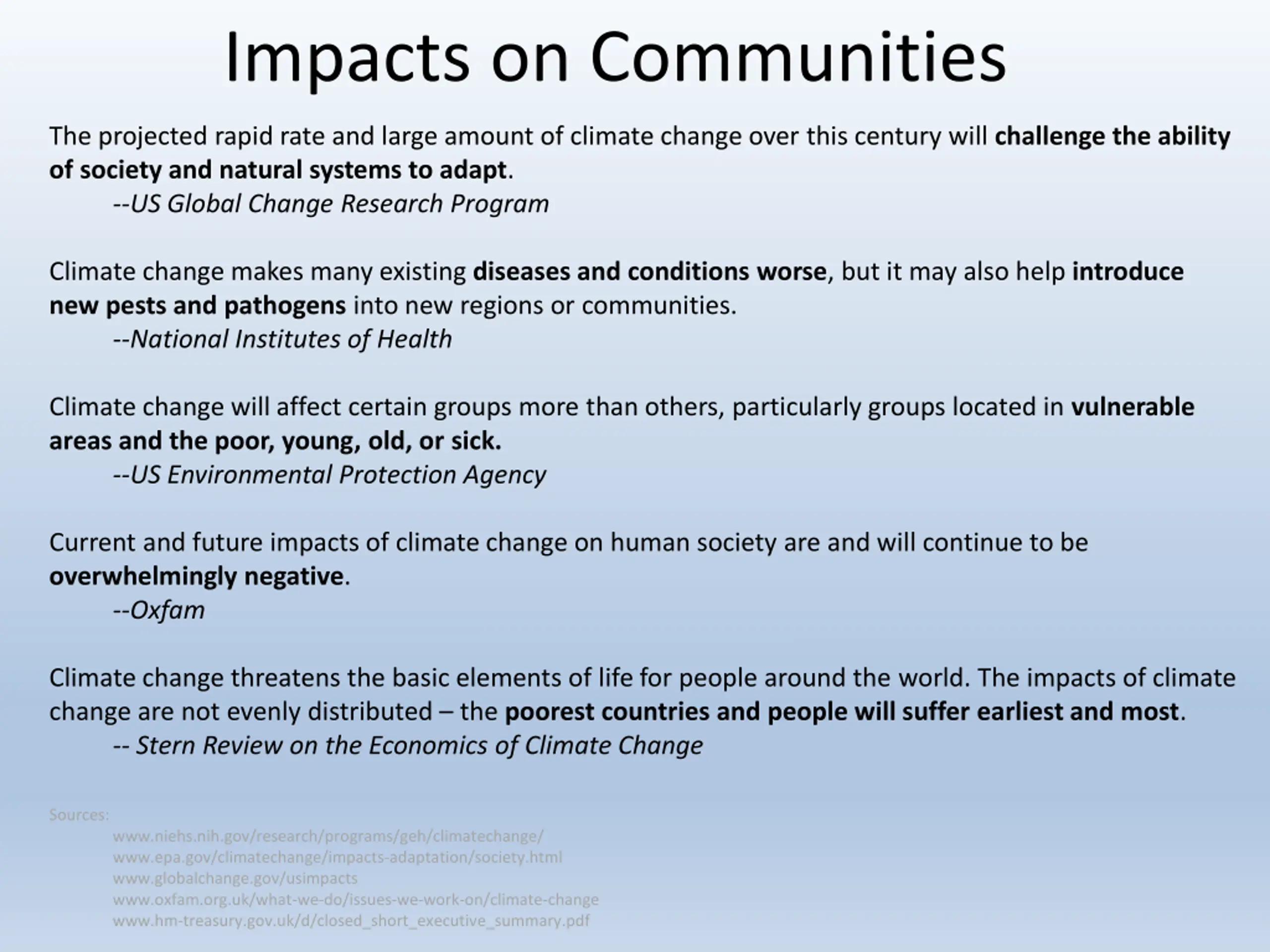 Impacts on Communities The projected rapid rate and large amount of climate change over this century will challenge the ability of society and natural systems to adapt. --US Global Change Research Program Climate change makes many existing diseases and conditions worse, but it may also help introduce new pests and pathogens into new regions or communities. --National Institutes of Health Climate change will affect certain groups more than others, particularly groups located in vulnerable areas and the poor, young, old, or sick. --US Environmental Protection Agency Current and future impacts of climate change on human society are and will continue to be overwhelmingly negative. --Oxfam Climate change threatens the basic elements of life for people around the world. The impacts of climate change are not evenly distributed the poorest countries and people will suffer earliest and most. -- Stern Review on the Economics of Climate Change Sources: www.niehs.nih.gov/research/programs/geh/climatechange/ www.epa.gov/climatechange/impacts-adaptation/society.html www.globalchange.gov/usimpacts www.oxfam.org.uk/what-we-do/issues-we-work-on/climate-change www.hm-treasury.gov.uk/d/closed_short_executive_summary.pdf
